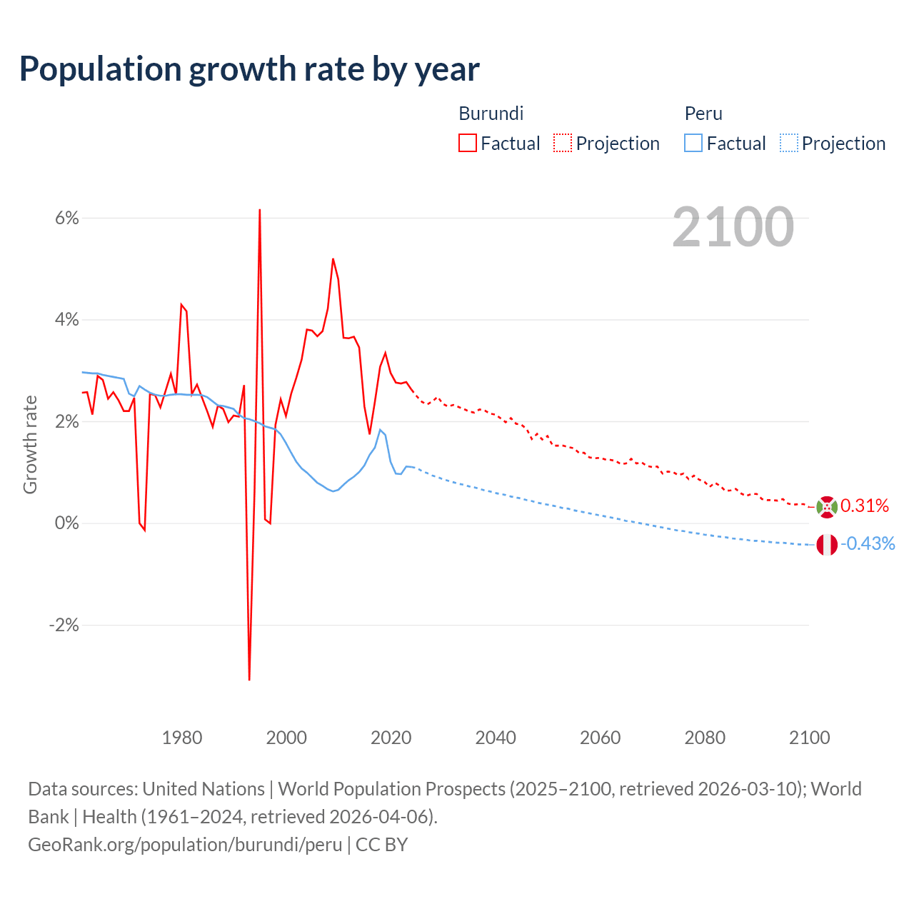 - For the last 10 years, Burundi has had an average growth rate of +2.74% per year vs +1.26% in Peru.