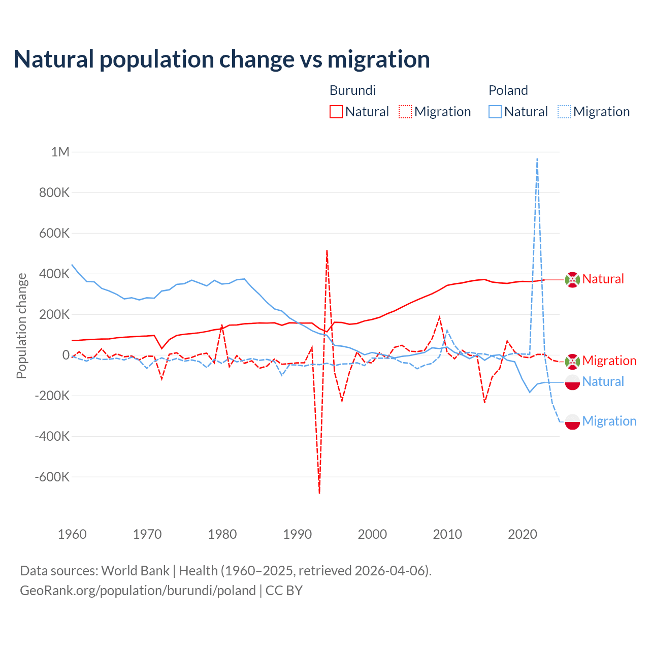 Over the last 10 years, 91% of the population change in Burundi is from natural causes (a gain of 3,614,502 people) and 9.03% is from migration (a loss of 358,928 people). In Poland 41.4% is from natural causes (a loss of 675,443 people) and 58.6% is from migration (a gain of 955,766 people).