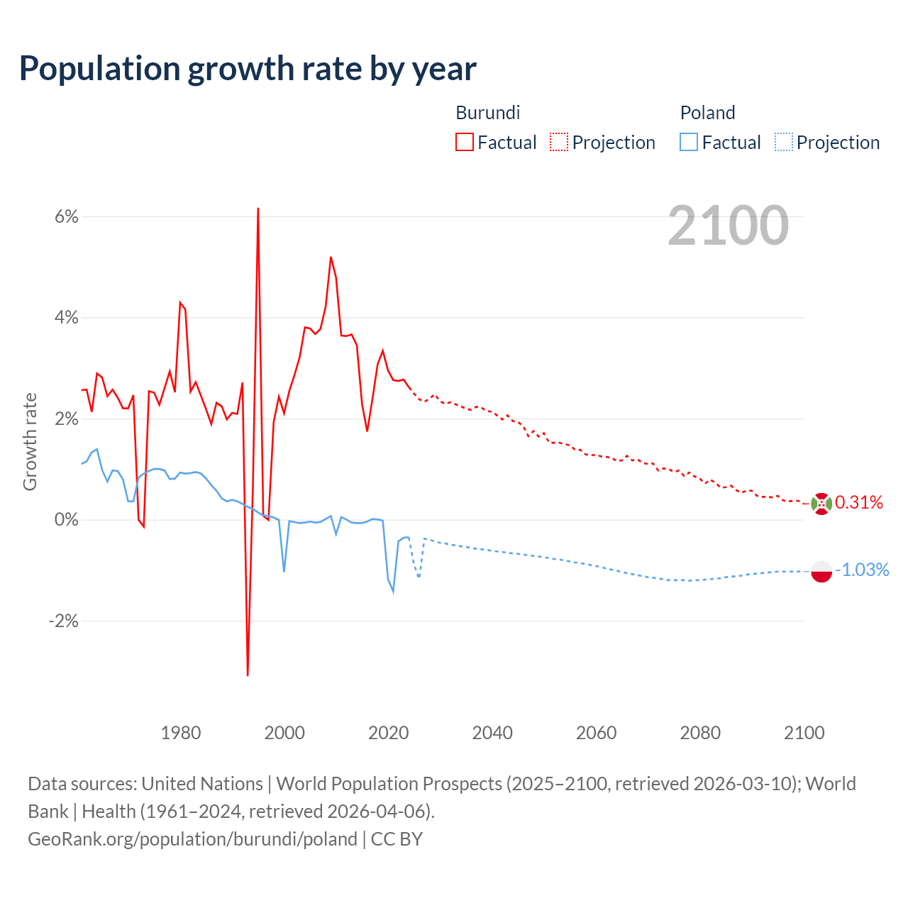 - For the last 10 years, Burundi has had an average growth rate of +2.74% per year vs -0.36% in Poland.