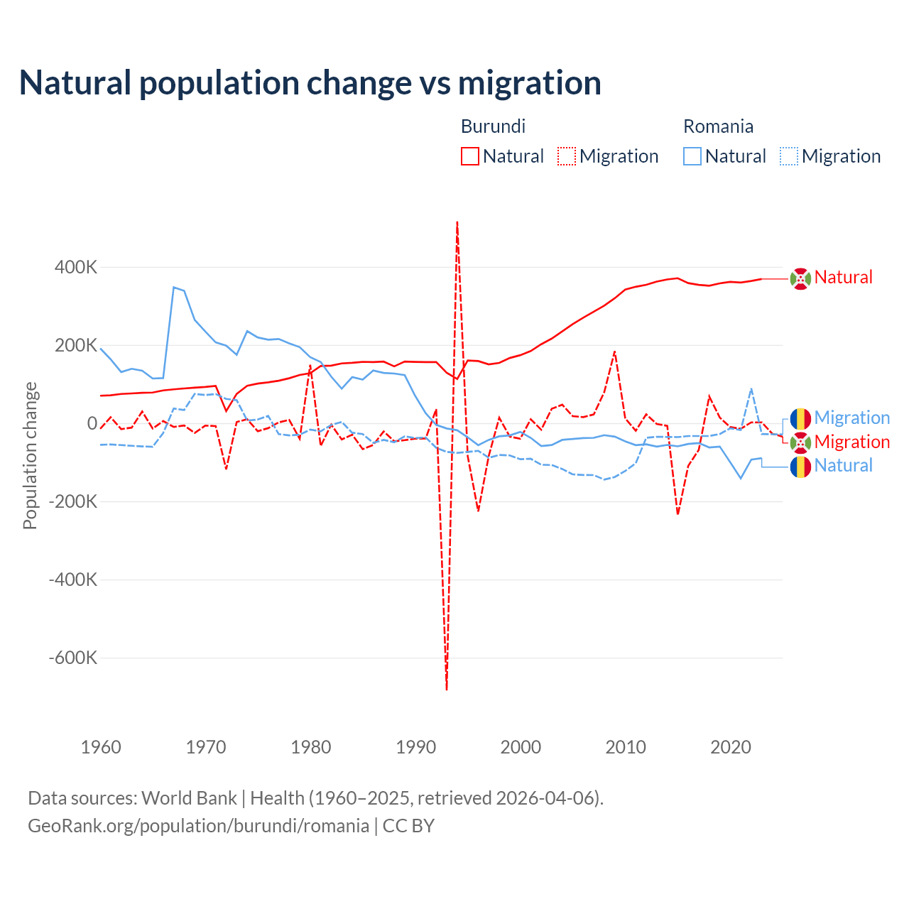 Over the last 10 years, 91% of the population change in Burundi is from natural causes (a gain of 3,614,502 people) and 9.03% is from migration (a loss of 358,928 people). In Romania 82% is from natural causes (a loss of 766,295 people) and 18% is from migration (a loss of 167,917 people).