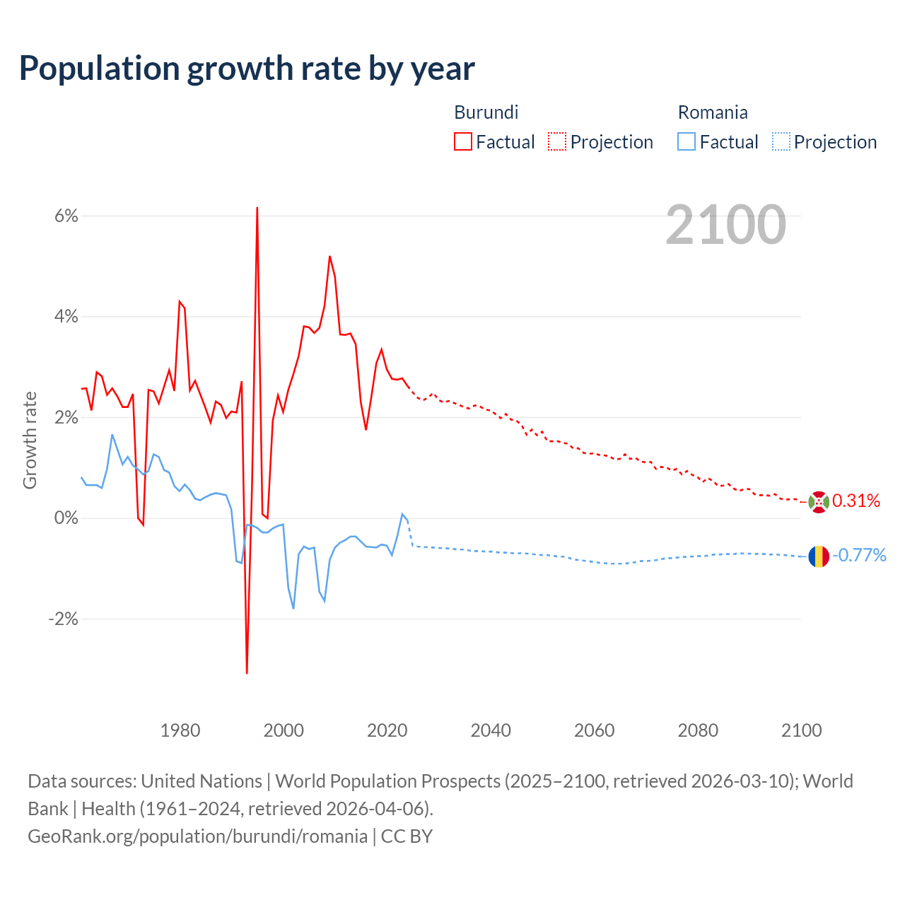 - For the last 10 years, Burundi has had an average growth rate of +2.74% per year vs -0.43% in Romania.