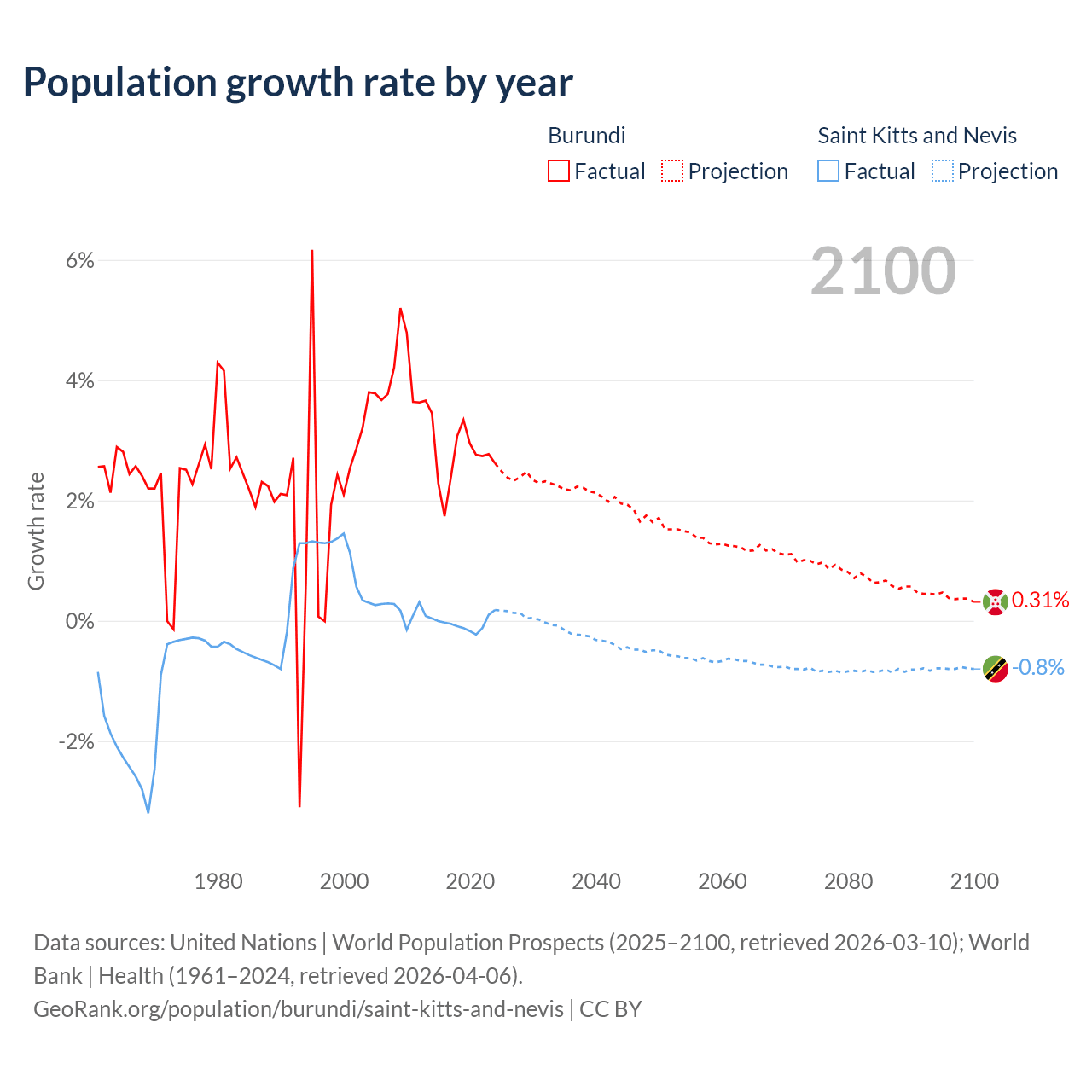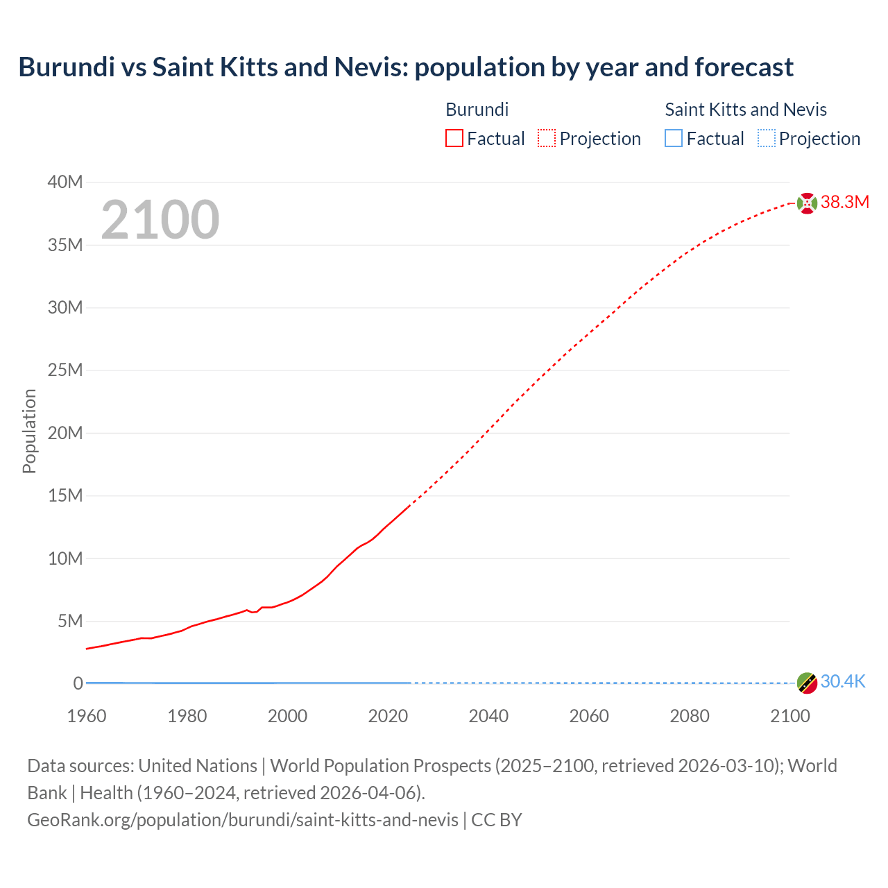 Burundi vs Saint Kitts and Nevis: population by year and forecast