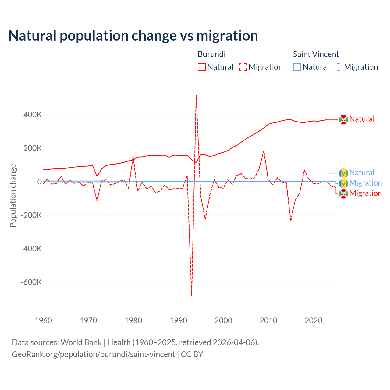 Over the last 10 years, 91% of the population change in Burundi is from natural causes (a gain of 3,614,502 people) and 9.03% is from migration (a loss of 358,928 people). In Saint Vincent 21.2% is from natural causes (a gain of 2,525 people) and 78.8% is from migration (a loss of 9,393 people).