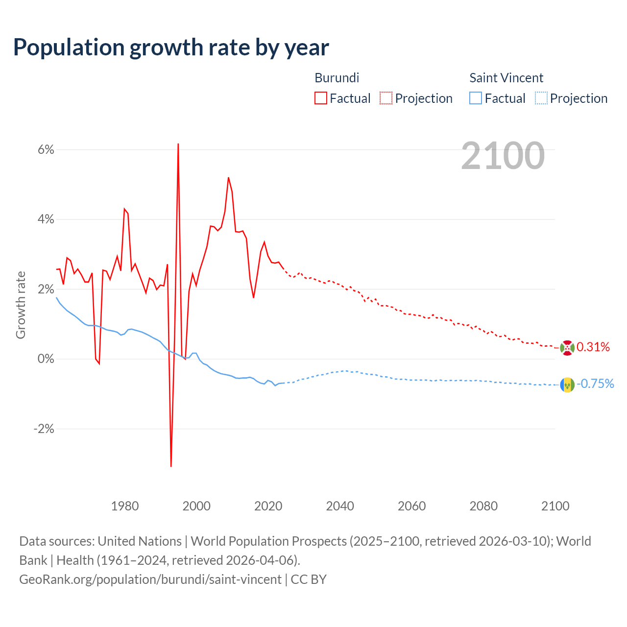 - For the last 10 years, Burundi has had an average growth rate of +2.74% per year vs -0.65% in Saint Vincent.