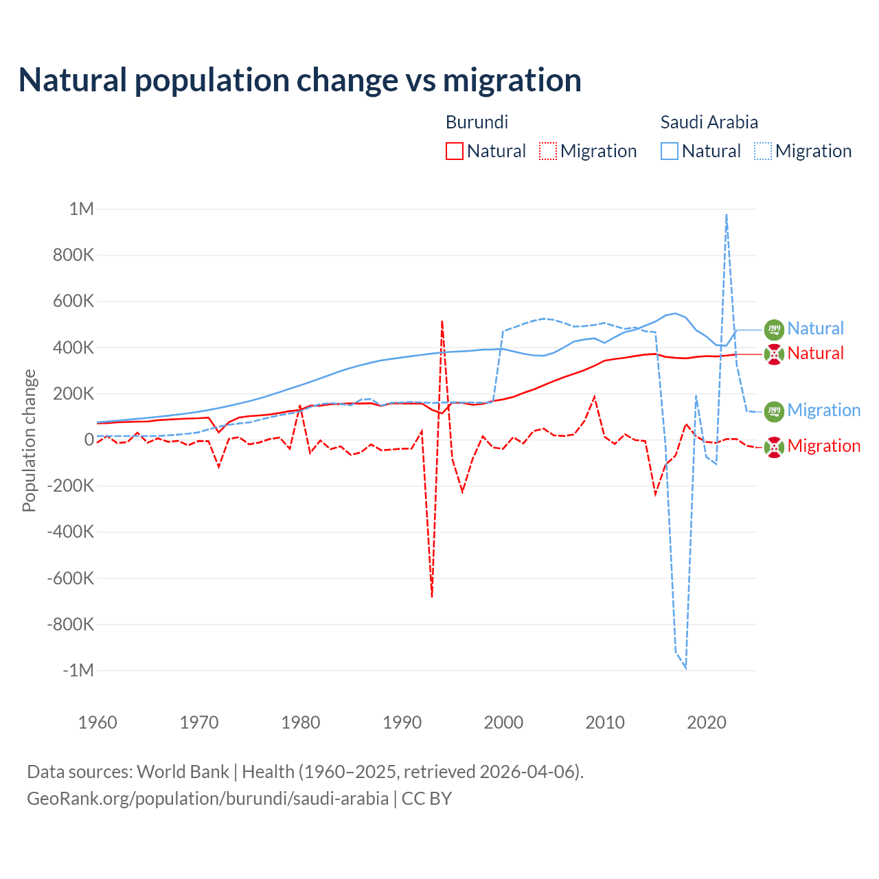 Over the last 10 years, 91% of the population change in Burundi is from natural causes (a gain of 3,614,502 people) and 9.03% is from migration (a loss of 358,928 people). In Saudi Arabia 93.9% is from natural causes (a gain of 4,829,562 people) and 6.05% is from migration (a gain of 311,209 people).