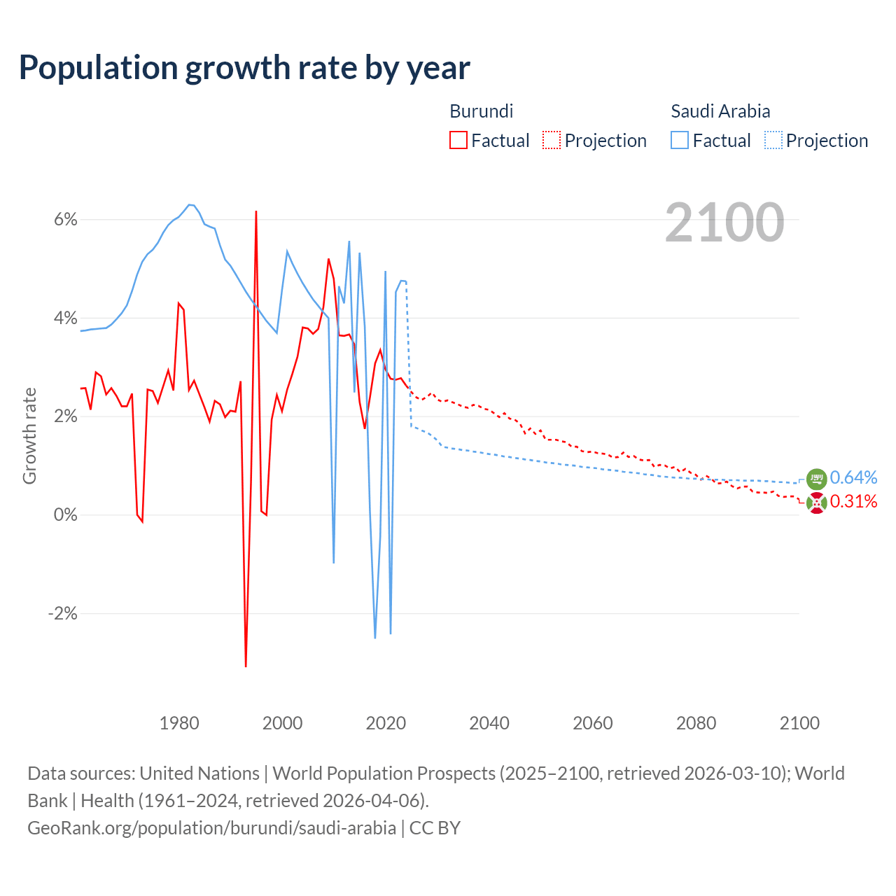- For the last 10 years, Burundi has had an average growth rate of +2.74% per year vs +2.3% in Saudi Arabia.