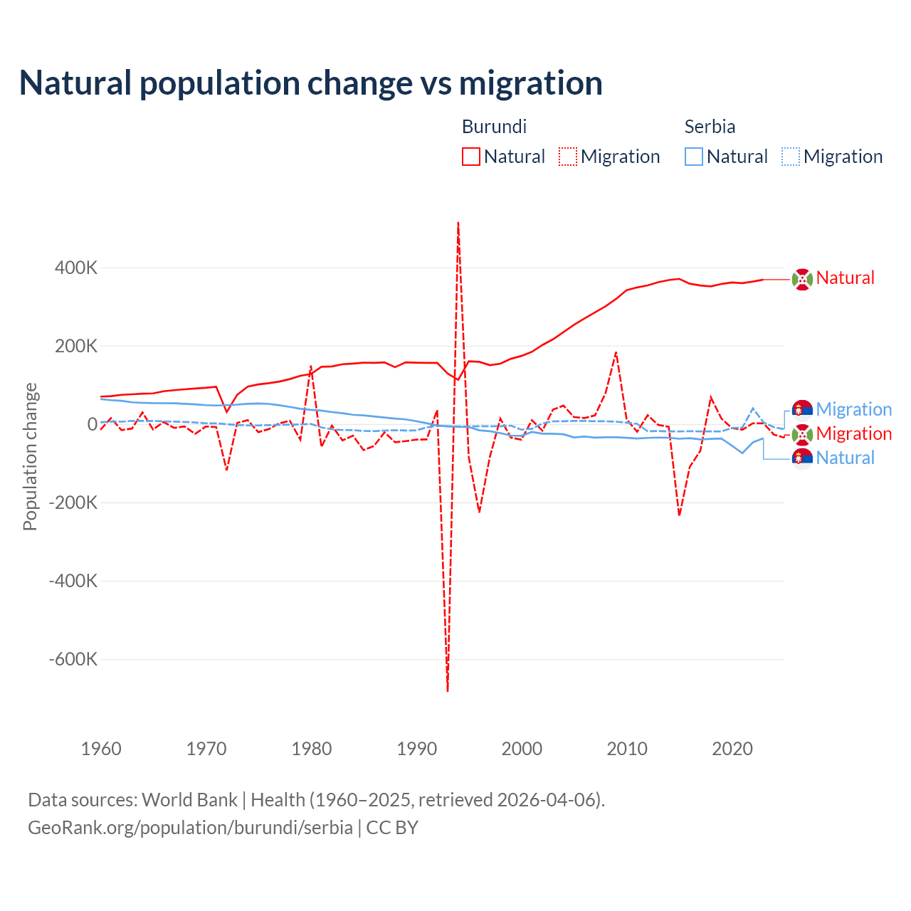 Over the last 10 years, 91% of the population change in Burundi is from natural causes (a gain of 3,614,502 people) and 9.03% is from migration (a loss of 358,928 people). In Serbia 83.3% is from natural causes (a loss of 435,148 people) and 16.7% is from migration (a loss of 87,110 people).
