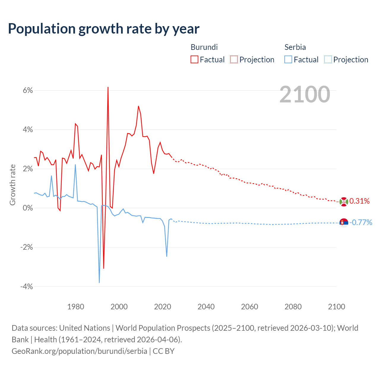 - For the last 10 years, Burundi has had an average growth rate of +2.74% per year vs -0.76% in Serbia.