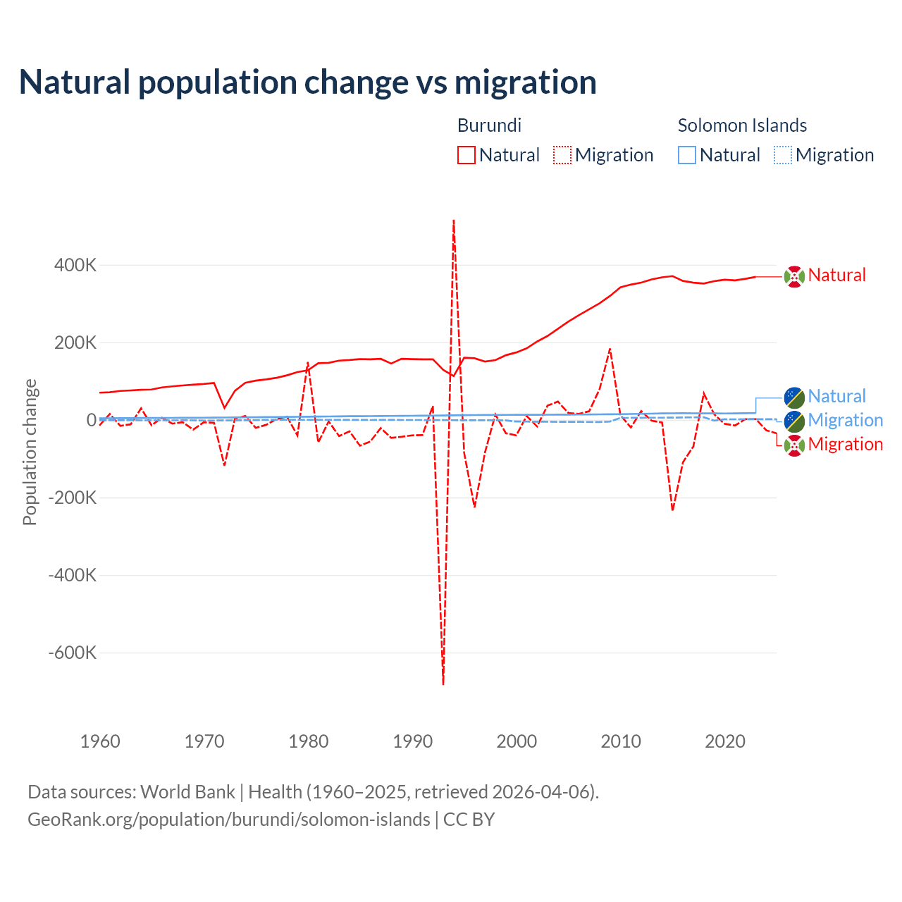 Over the last 10 years, 91% of the population change in Burundi is from natural causes (a gain of 3,614,502 people) and 9.03% is from migration (a loss of 358,928 people). In the Solomon Islands 82.8% is from natural causes (a gain of 168,727 people) and 17.2% is from migration (a gain of 35,031 people).