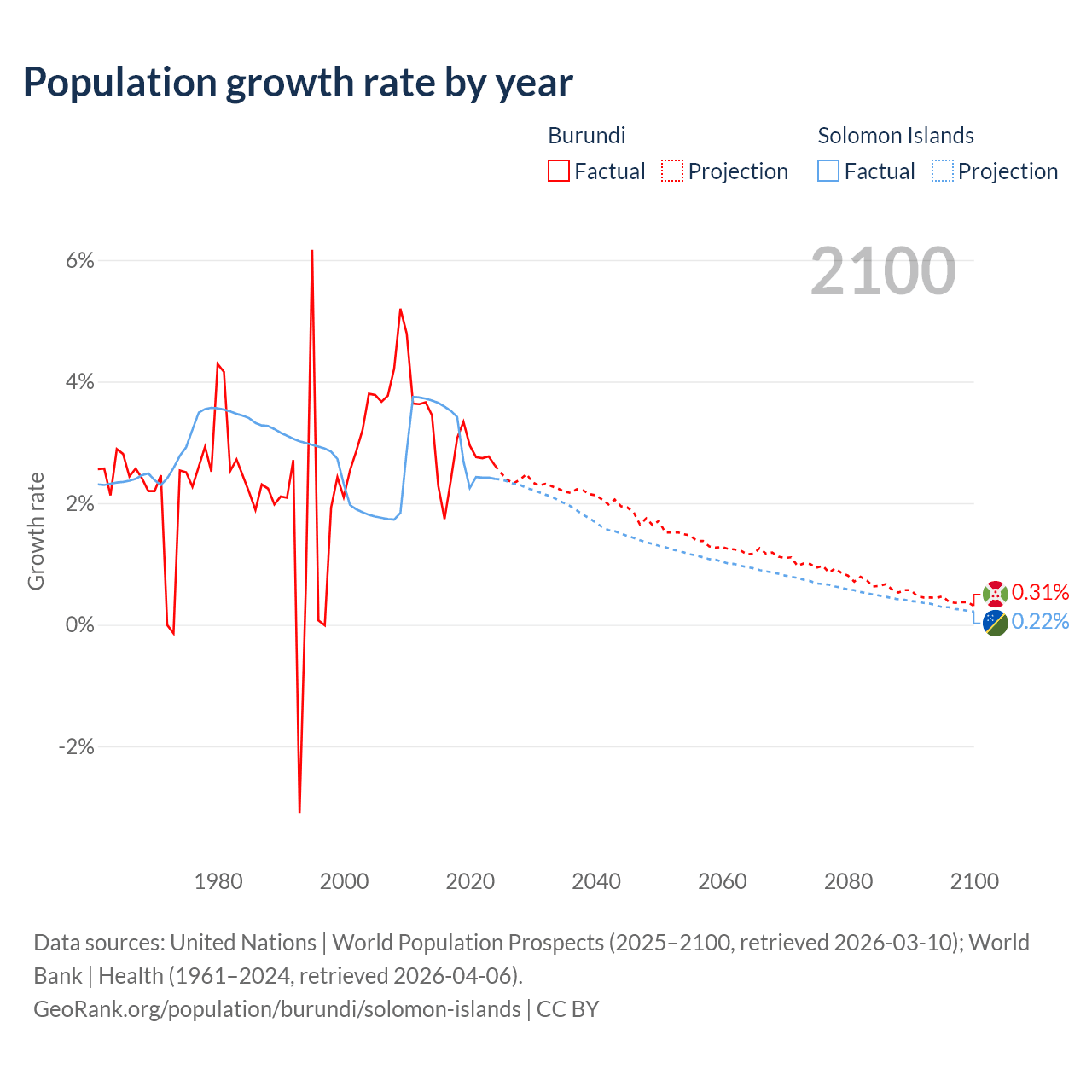 Burundi vs Solomon Islands: population by year and forecast