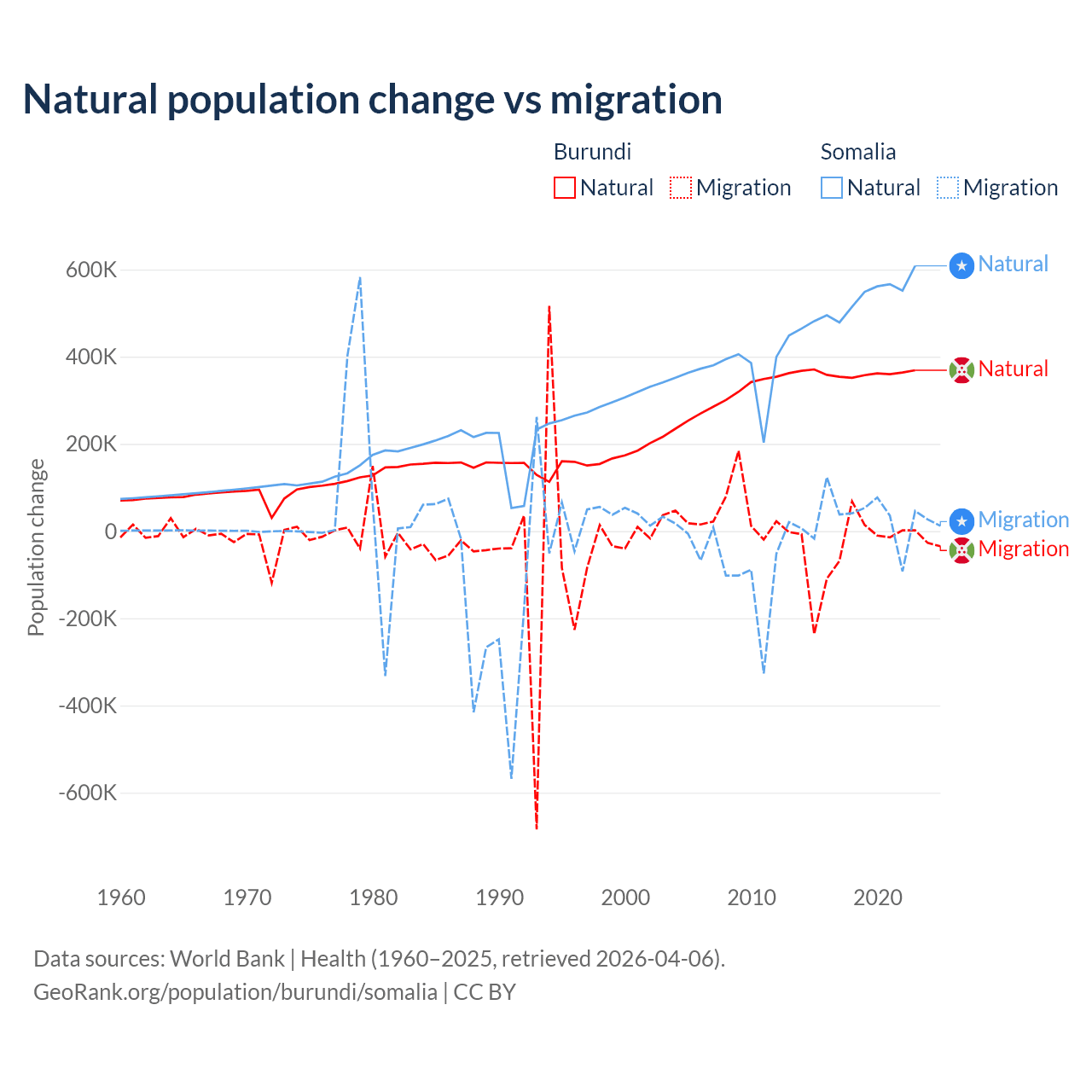 Over the last 10 years, 91% of the population change in Burundi is from natural causes (a gain of 3,614,502 people) and 9.03% is from migration (a loss of 358,928 people). In Somalia 94.4% is from natural causes (a gain of 5,270,105 people) and 5.58% is from migration (a gain of 311,487 people).
