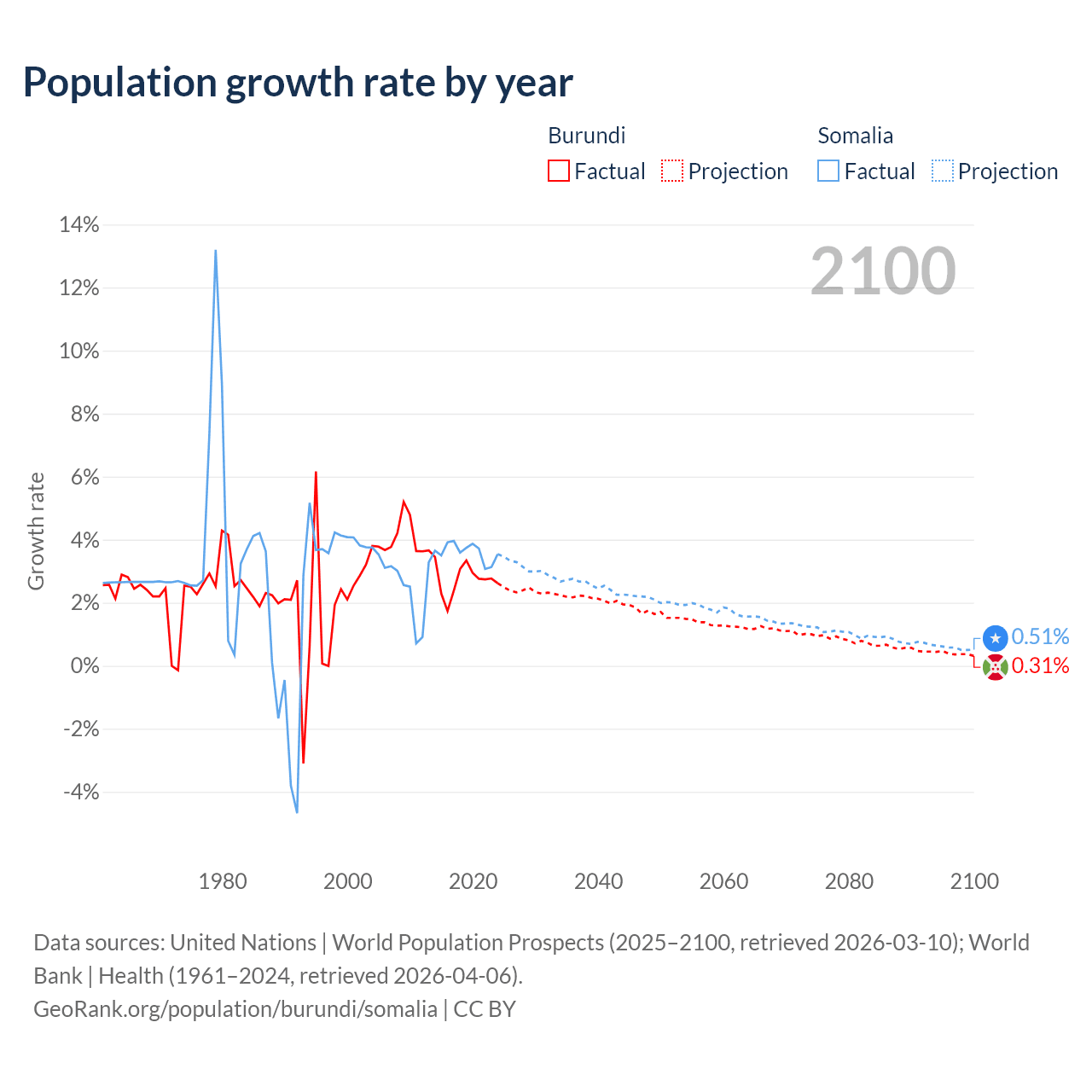 - For the last 10 years, Burundi has had an average growth rate of +2.74% per year vs +3.61% in Somalia.