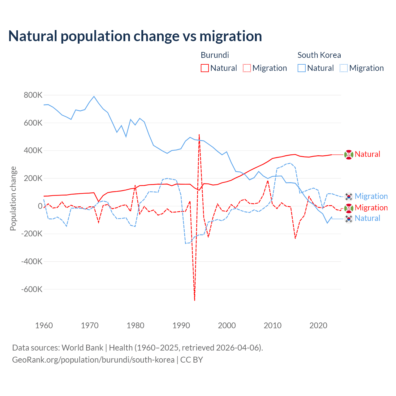 Over the last 10 years, 91% of the population change in Burundi is from natural causes (a gain of 3,614,502 people) and 9.03% is from migration (a loss of 358,928 people). In South Korea 17.6% is from natural causes (a gain of 277,215 people) and 82.4% is from migration (a gain of 1,298,356 people).