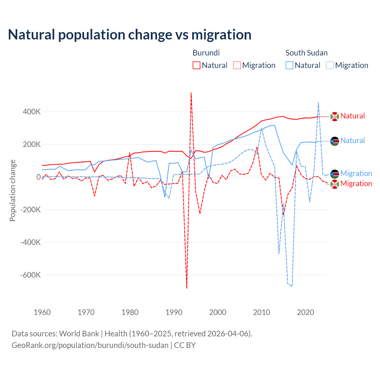 Over the last 10 years, 91% of the population change in Burundi is from natural causes (a gain of 3,614,502 people) and 9.03% is from migration (a loss of 358,928 people). In South Sudan 57.4% is from natural causes (a gain of 1,792,135 people) and 42.6% is from migration (a loss of 1,329,606 people).
