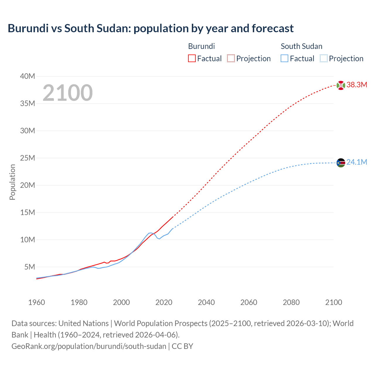 The latest officially reported population of Burundi was 14,047,786 in 2024 vs 11,943,408 people in South Sudan in 2024. In 2026, based on the adjusted UN estimation, the current Burundi's population is 14,833,763 people compared to 12,507,858 in South Sudan.