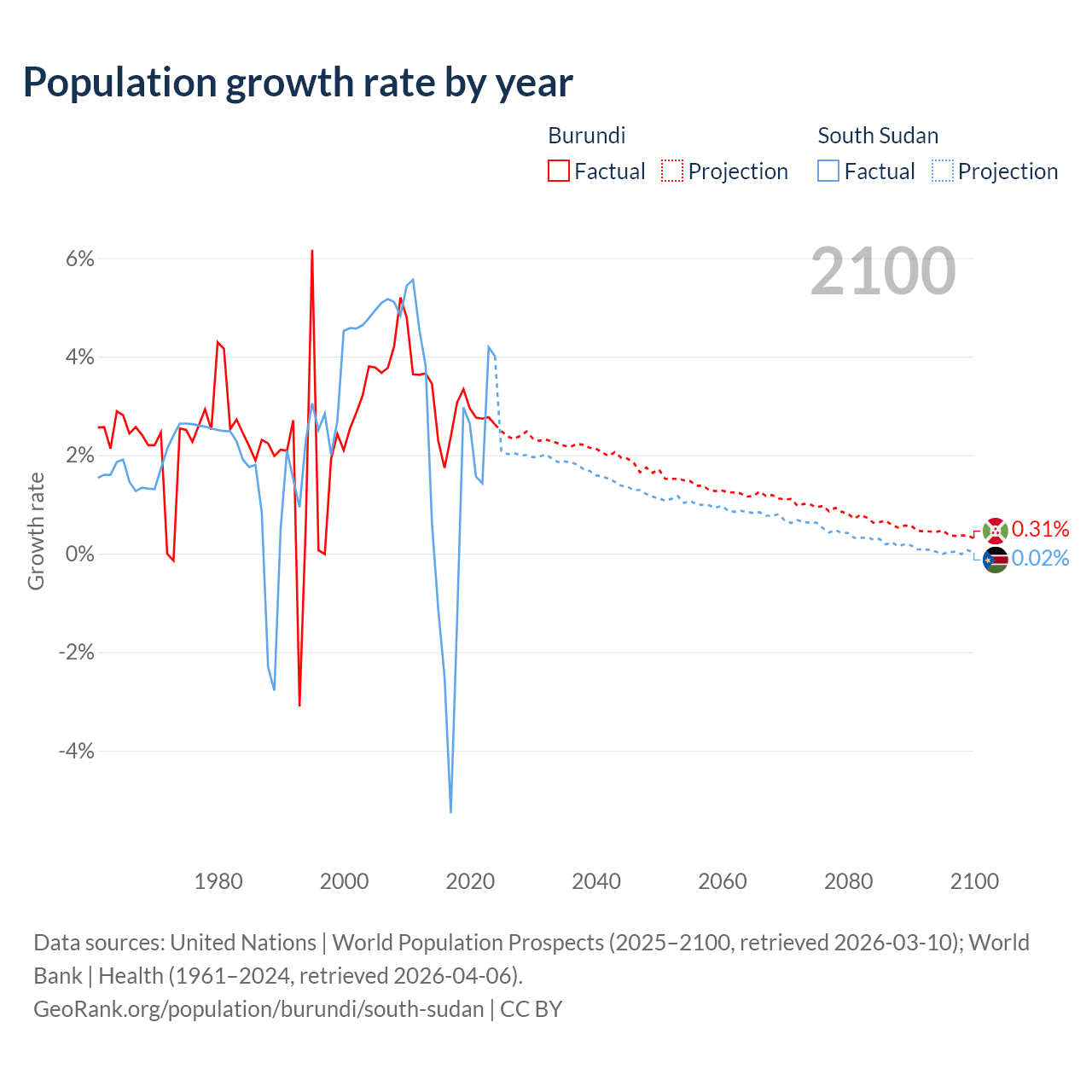 - For the last 10 years, Burundi has had an average growth rate of +2.74% per year vs +0.65% in South Sudan.