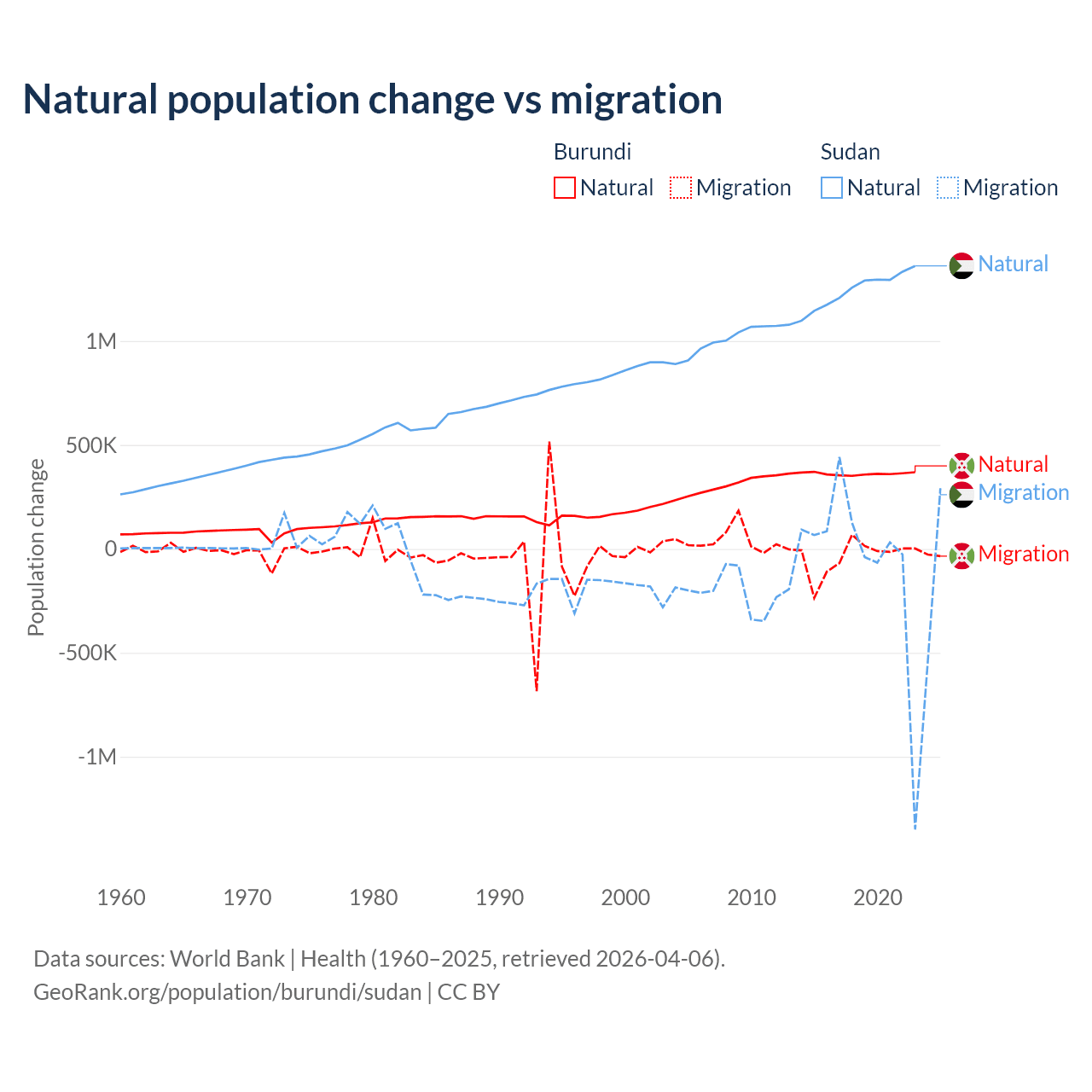 Over the last 10 years, 91% of the population change in Burundi is from natural causes (a gain of 3,614,502 people) and 9.03% is from migration (a loss of 358,928 people). In Sudan 95.1% is from natural causes (a gain of 12,459,977 people) and 4.88% is from migration (a loss of 639,596 people).