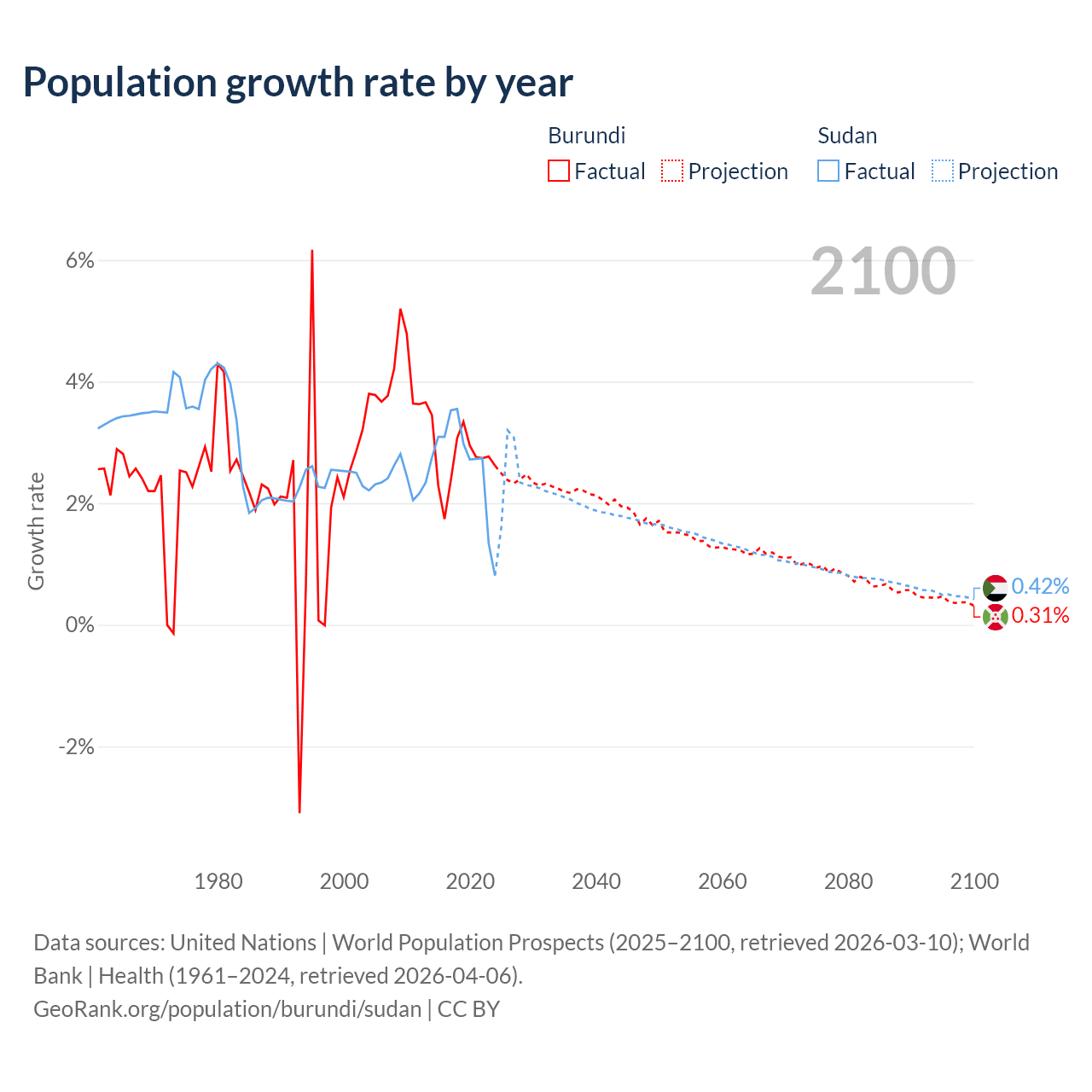- For the last 10 years, Burundi has had an average growth rate of +2.74% per year vs +2.67% in Sudan.