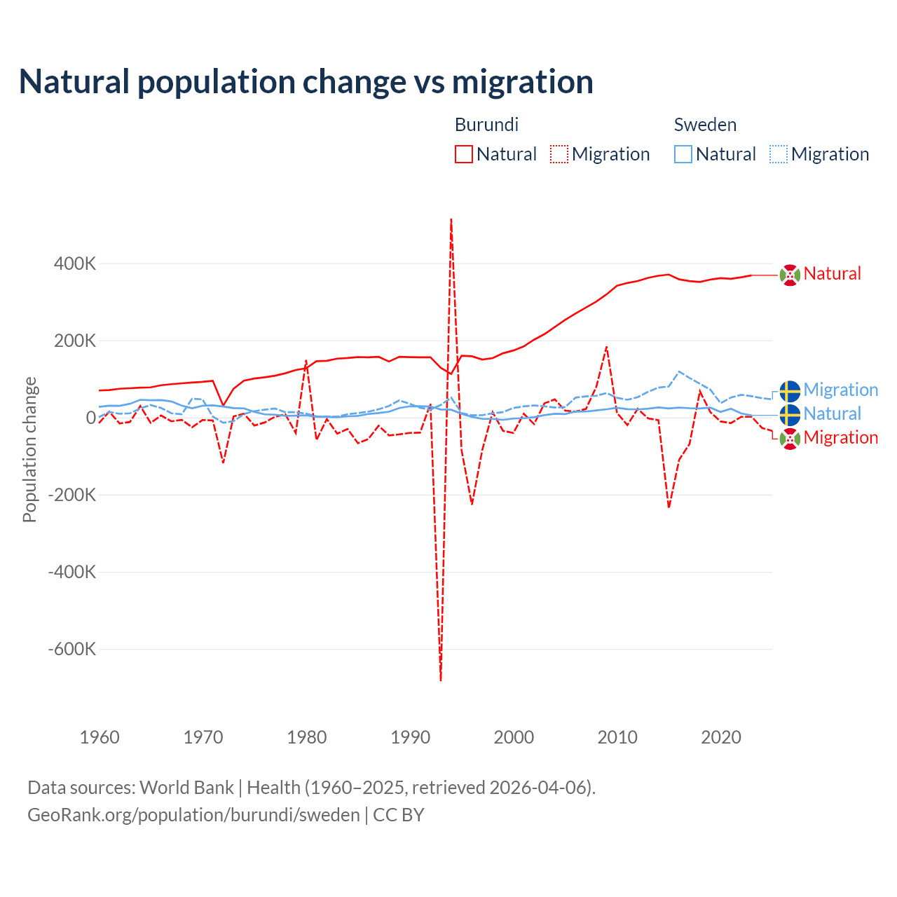 Over the last 10 years, 91% of the population change in Burundi is from natural causes (a gain of 3,614,502 people) and 9.03% is from migration (a loss of 358,928 people). In Sweden 21.4% is from natural causes (a gain of 201,900 people) and 78.6% is from migration (a gain of 743,642 people).