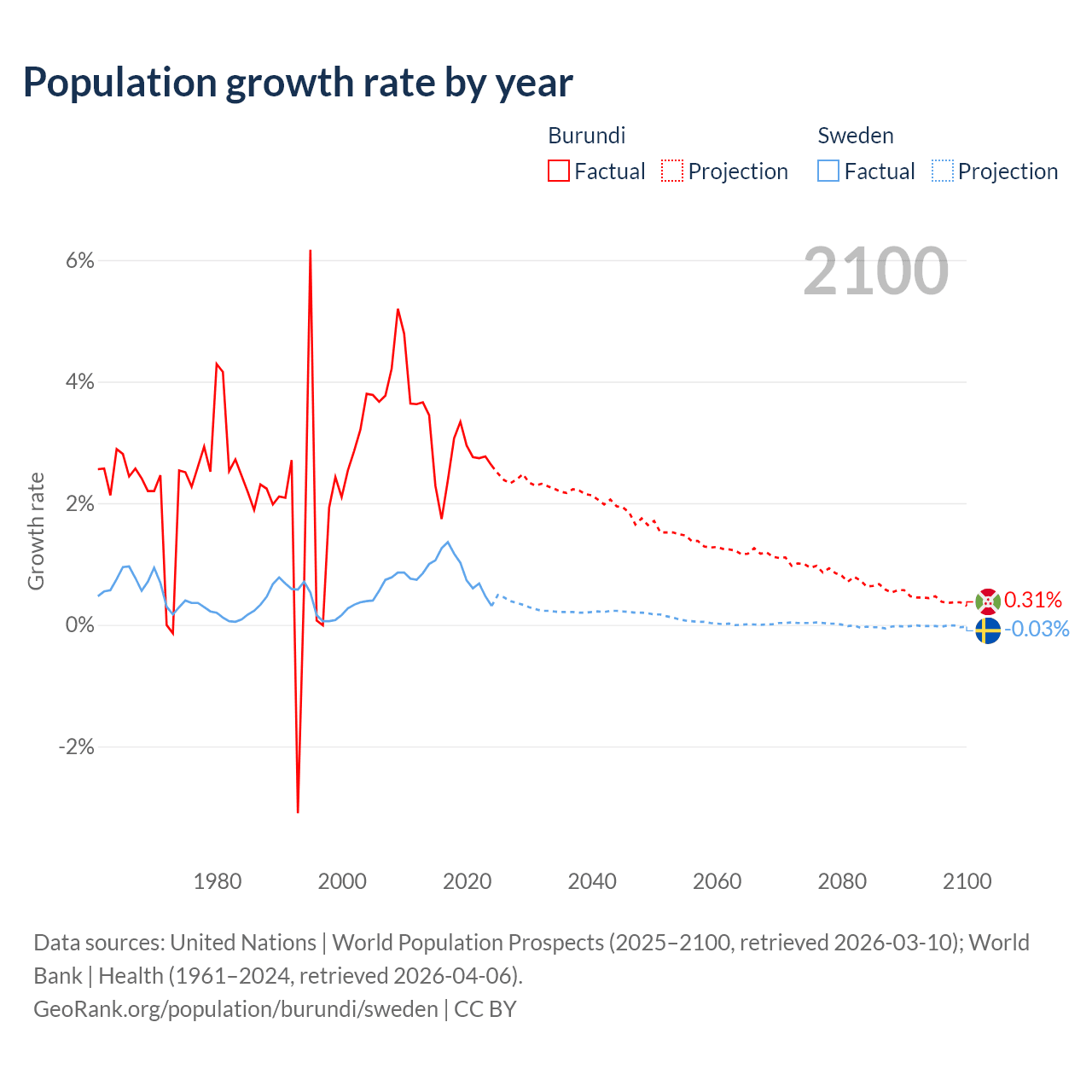 - For the last 10 years, Burundi has had an average growth rate of +2.74% per year vs +0.88% in Sweden.