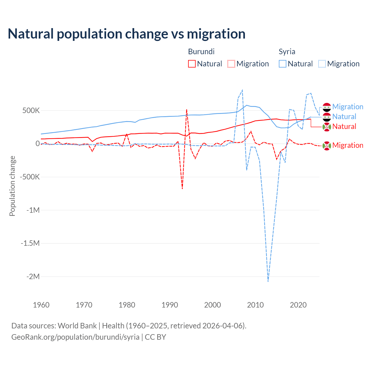 Over the last 10 years, 91% of the population change in Burundi is from natural causes (a gain of 3,614,502 people) and 9.03% is from migration (a loss of 358,928 people). In Syria 91.3% is from natural causes (a gain of 3,047,621 people) and 8.72% is from migration (a gain of 291,069 people).