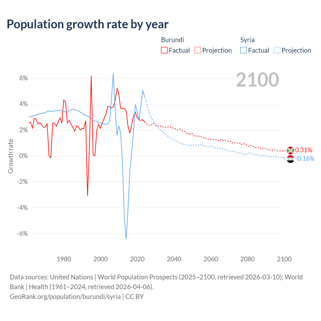 - For the last 10 years, Burundi has had an average growth rate of +2.74% per year vs +1.25% in Syria.