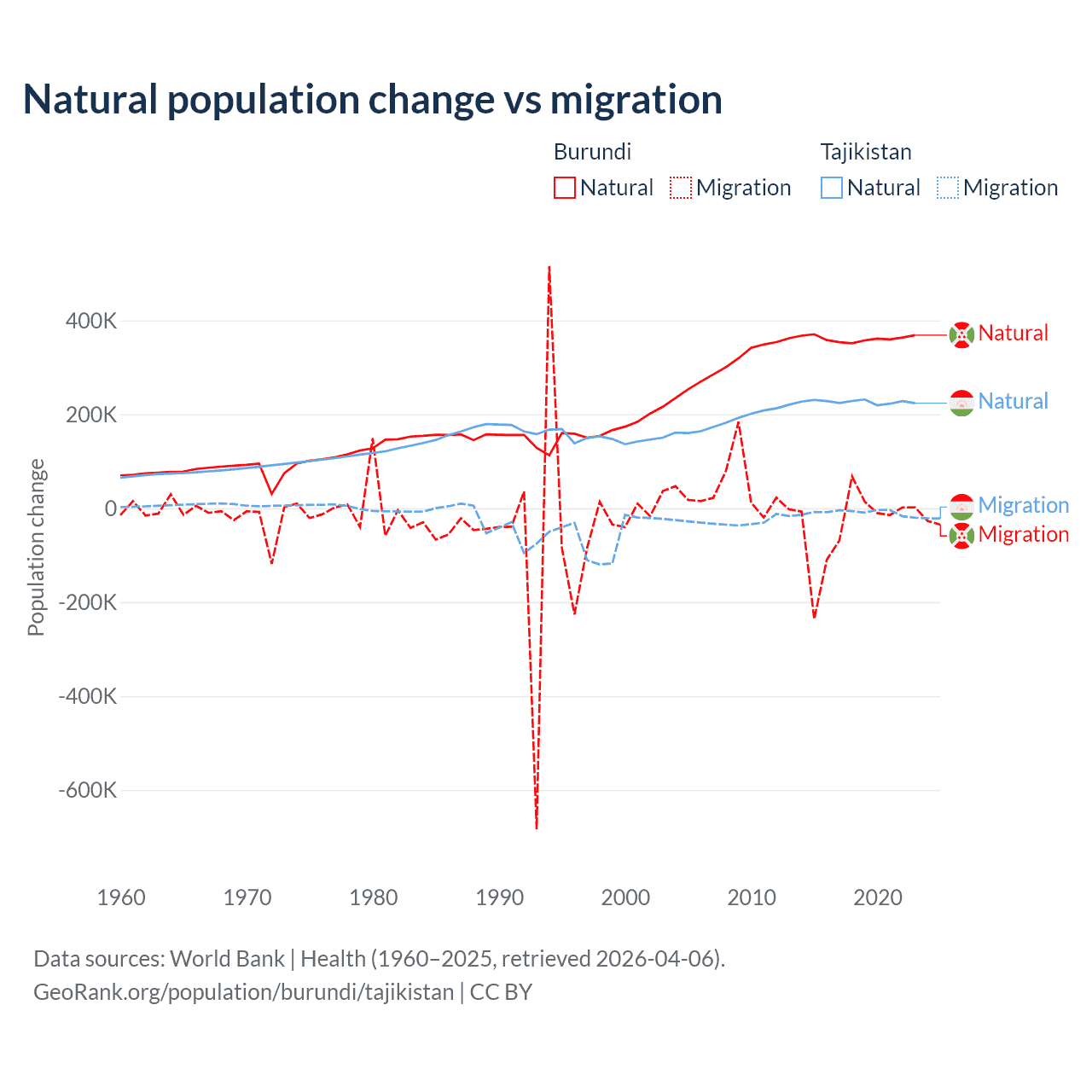 Over the last 10 years, 91% of the population change in Burundi is from natural causes (a gain of 3,614,502 people) and 9.03% is from migration (a loss of 358,928 people). In Tajikistan 96% is from natural causes (a gain of 2,266,045 people) and 3.95% is from migration (a loss of 93,205 people).