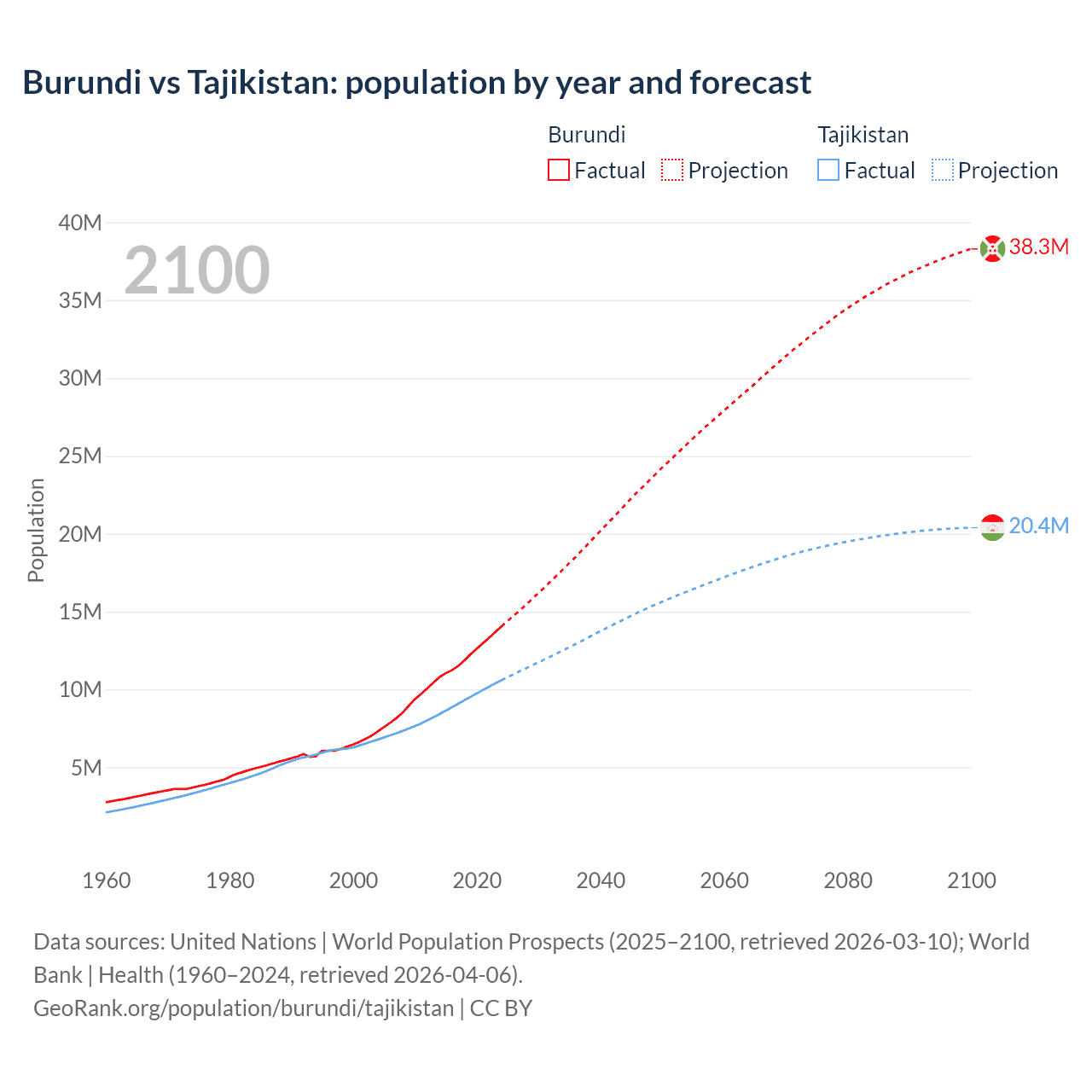 The latest officially reported population of Burundi was 14,047,786 in 2024 vs 10,590,927 people in Tajikistan in 2024. In 2026, based on the adjusted UN estimation, the current Burundi's population is 14,833,763 people compared to 11,038,274 in Tajikistan.