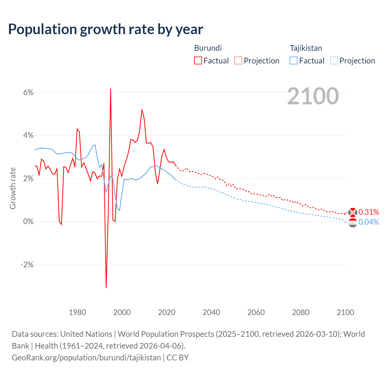 - For the last 10 years, Burundi has had an average growth rate of +2.74% per year vs +2.33% in Tajikistan.
