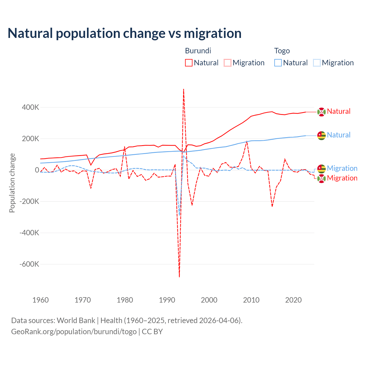 Over the last 10 years, 91% of the population change in Burundi is from natural causes (a gain of 3,614,502 people) and 9.03% is from migration (a loss of 358,928 people). In Togo 99.1% is from natural causes (a gain of 2,052,115 people) and 0.86% is from migration (a loss of 17,852 people).