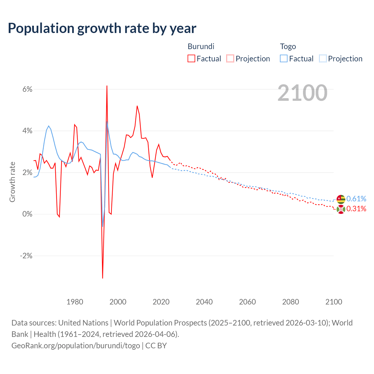 - For the last 10 years, Burundi has had an average growth rate of +2.74% per year vs +2.46% in Togo.