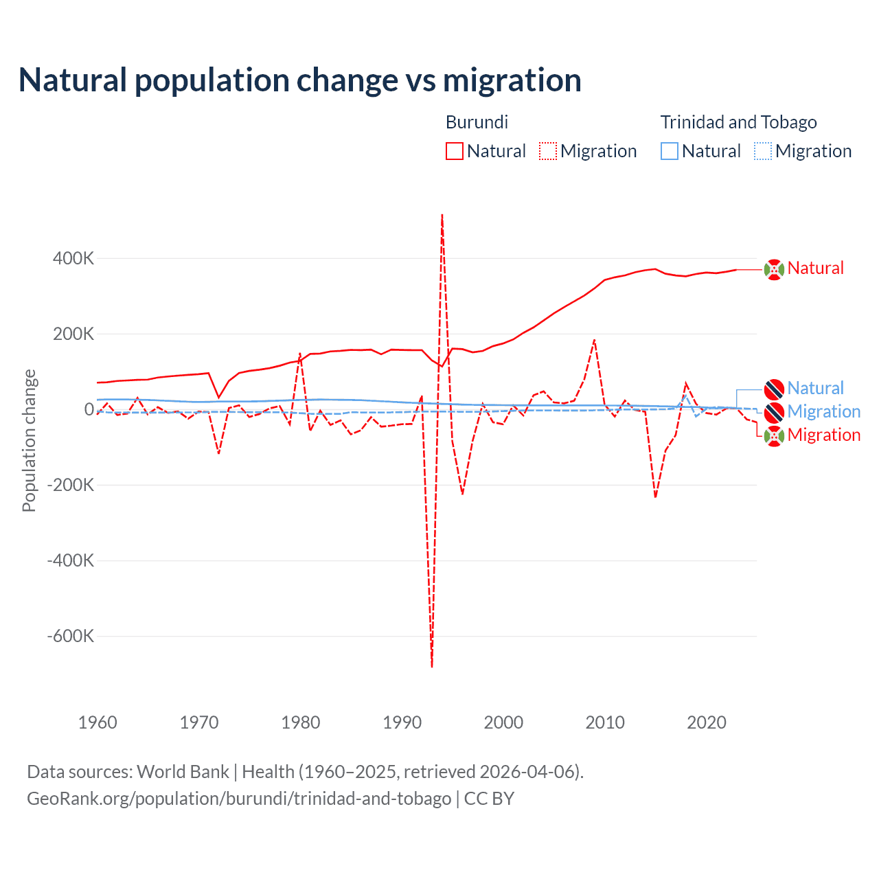Over the last 10 years, 91% of the population change in Burundi is from natural causes (a gain of 3,614,502 people) and 9.03% is from migration (a loss of 358,928 people). In Trinidad and Tobago 66% is from natural causes (a gain of 55,887 people) and 34% is from migration (a gain of 28,785 people).