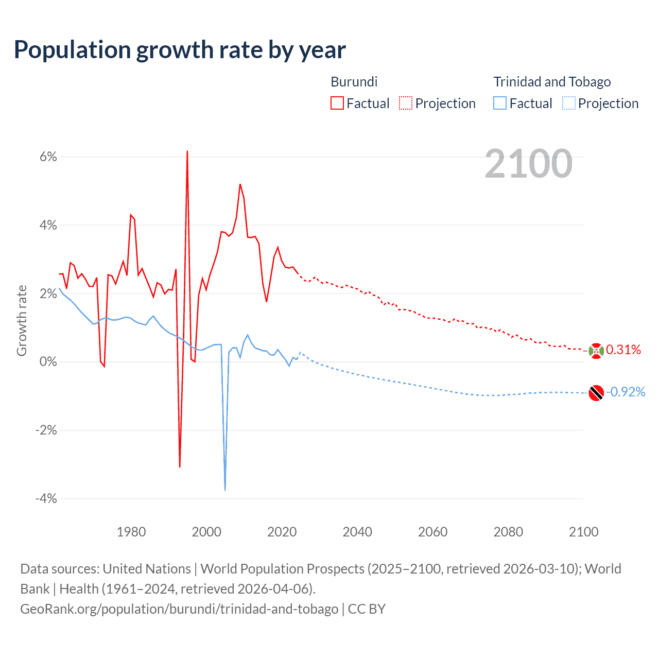 - For the last 10 years, Burundi has had an average growth rate of +2.74% per year vs +0.19% in Trinidad and Tobago.