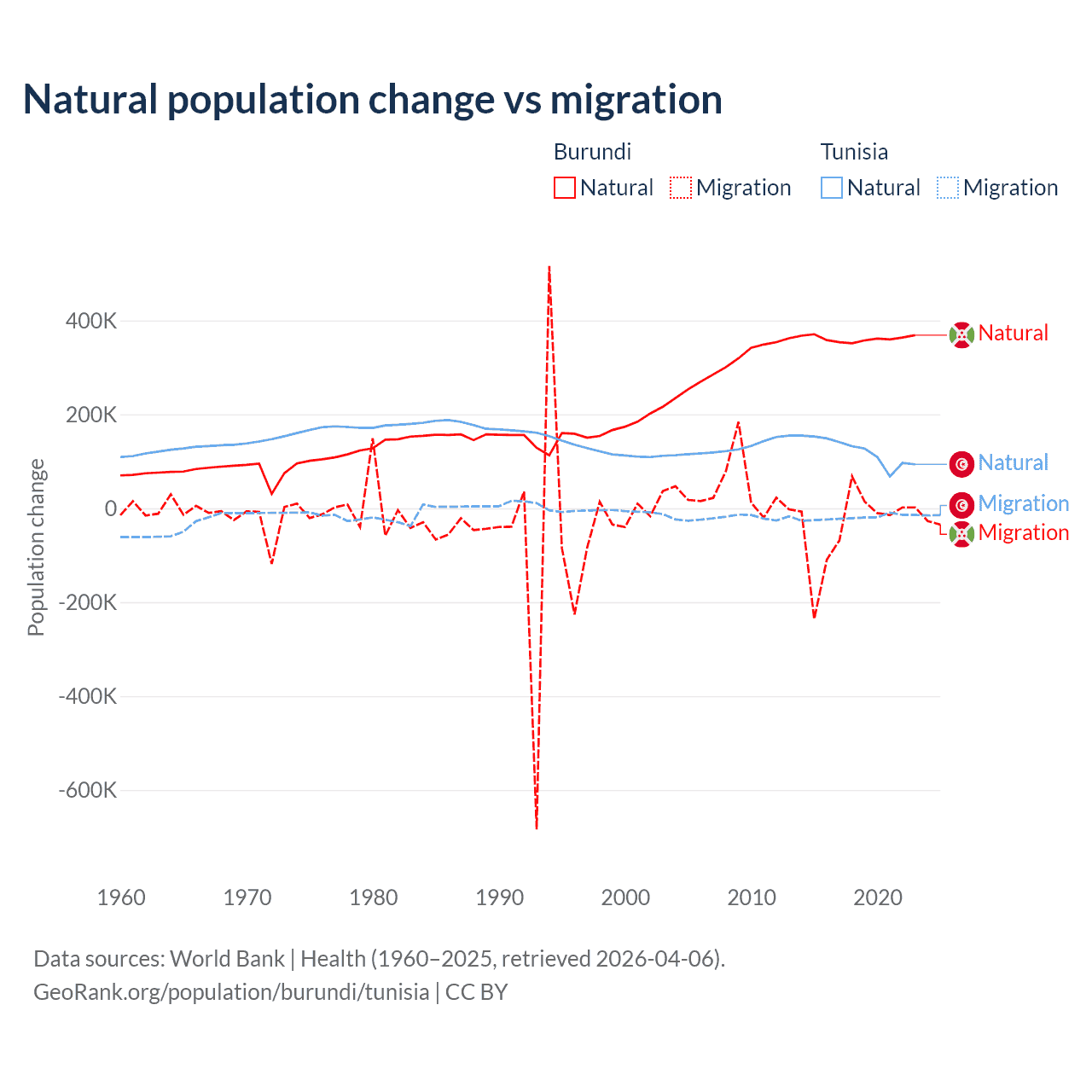 Over the last 10 years, 91% of the population change in Burundi is from natural causes (a gain of 3,614,502 people) and 9.03% is from migration (a loss of 358,928 people). In Tunisia 86.3% is from natural causes (a gain of 1,225,079 people) and 13.7% is from migration (a loss of 195,011 people).
