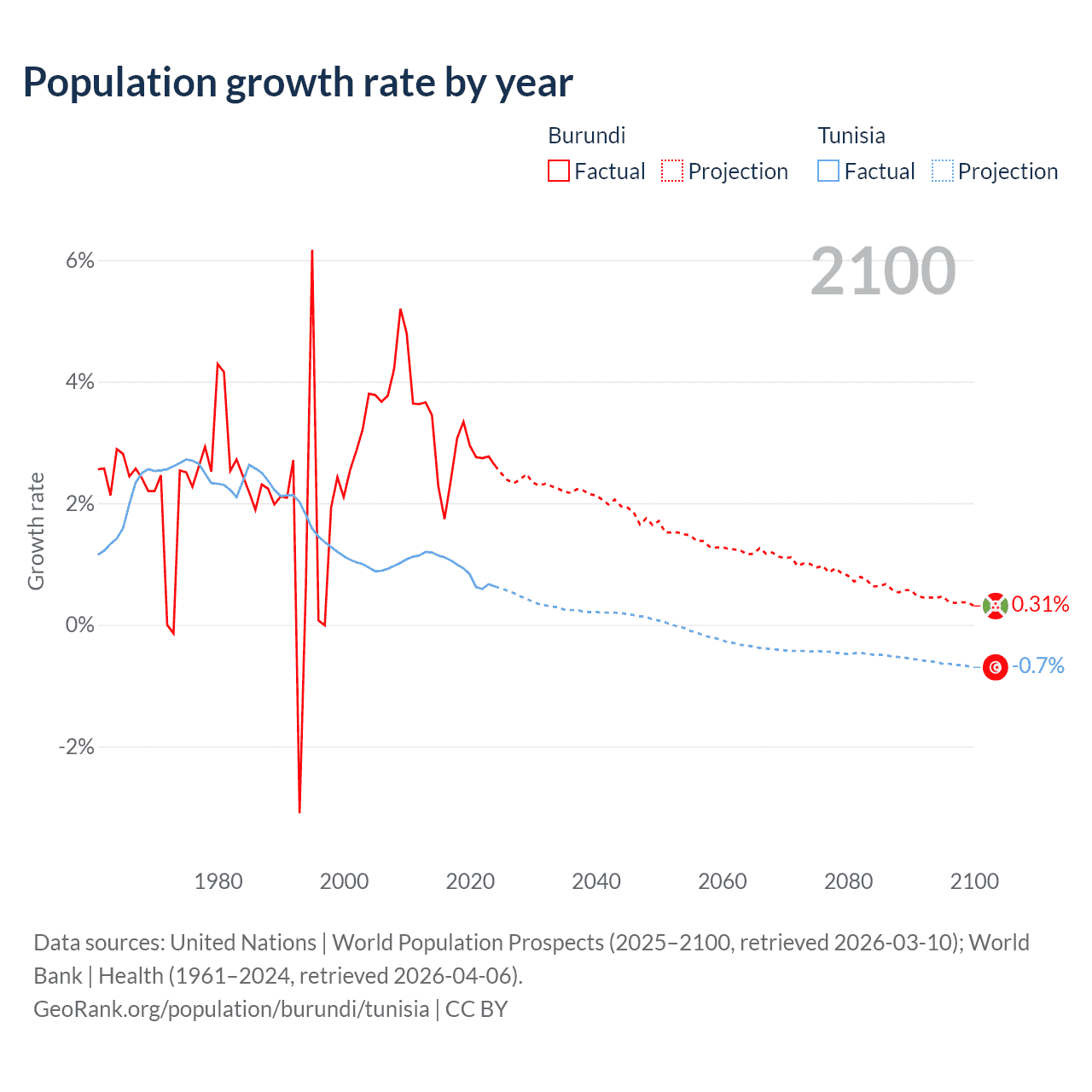 - For the last 10 years, Burundi has had an average growth rate of +2.74% per year vs +0.89% in Tunisia.