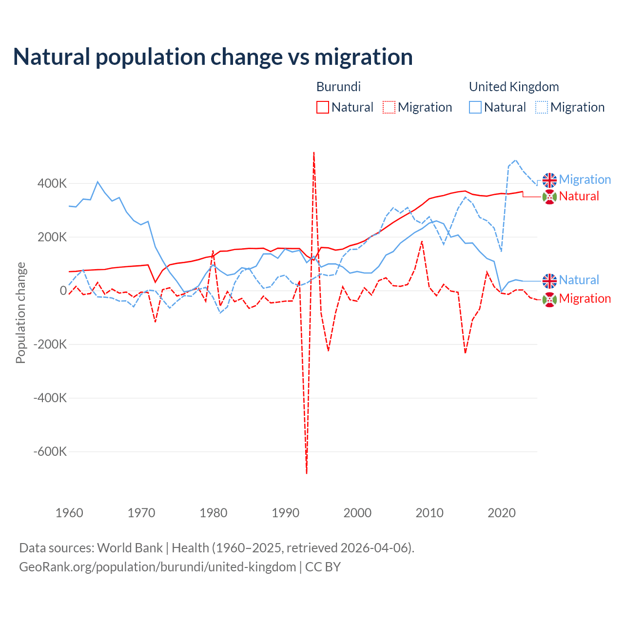 Over the last 10 years, 91% of the population change in Burundi is from natural causes (a gain of 3,614,502 people) and 9.03% is from migration (a loss of 358,928 people). In the United Kingdom 23.9% is from natural causes (a gain of 1,033,129 people) and 76.1% is from migration (a gain of 3,283,101 people).