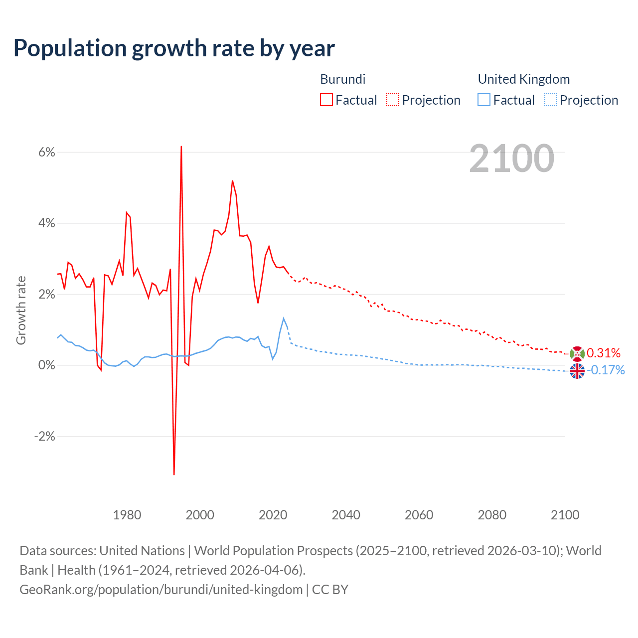 - For the last 10 years, Burundi has had an average growth rate of +2.74% per year vs +0.7% in the United Kingdom.