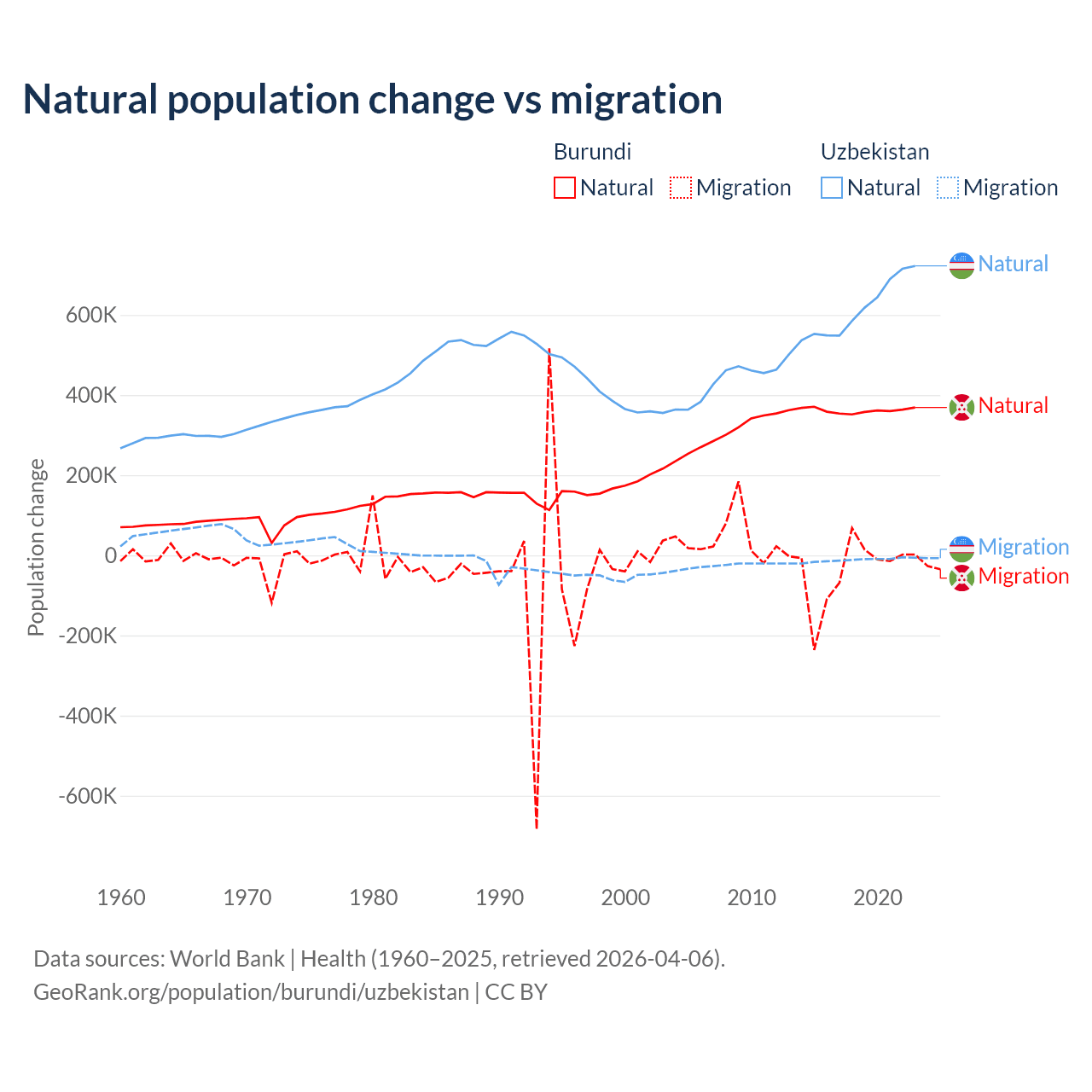 Over the last 10 years, 91% of the population change in Burundi is from natural causes (a gain of 3,614,502 people) and 9.03% is from migration (a loss of 358,928 people). In Uzbekistan 98.2% is from natural causes (a gain of 6,161,117 people) and 1.84% is from migration (a loss of 115,398 people).