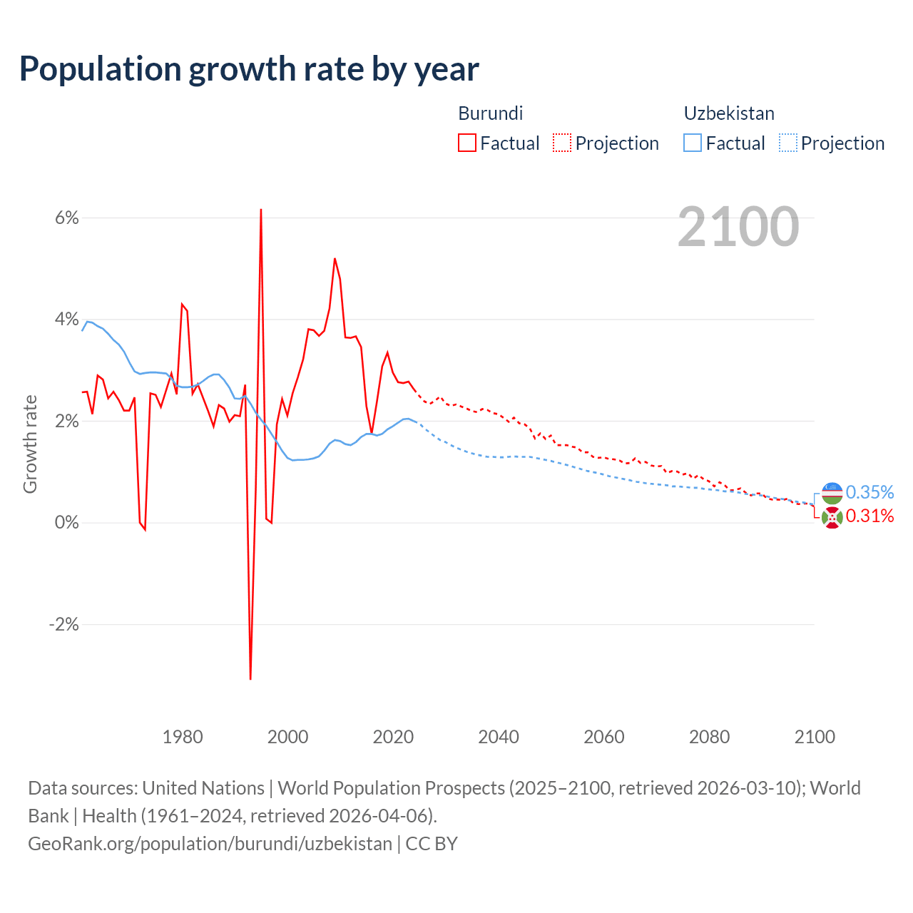 - For the last 10 years, Burundi has had an average growth rate of +2.74% per year vs +1.85% in Uzbekistan.