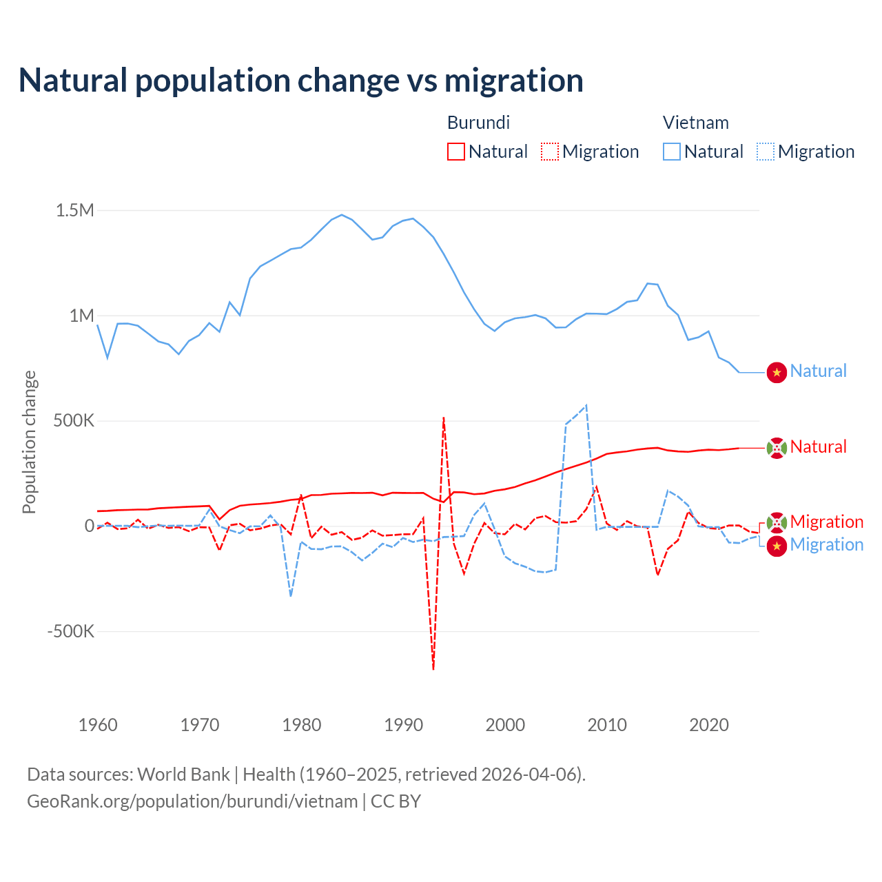 Over the last 10 years, 91% of the population change in Burundi is from natural causes (a gain of 3,614,502 people) and 9.03% is from migration (a loss of 358,928 people). In Vietnam 97.7% is from natural causes (a gain of 9,349,756 people) and 2.29% is from migration (a gain of 219,073 people).