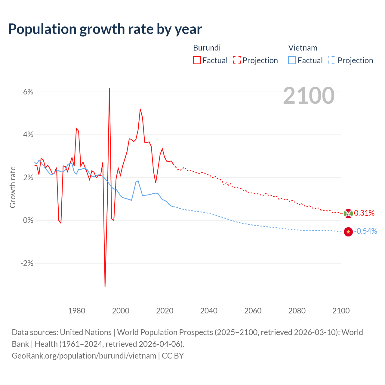 - For the last 10 years, Burundi has had an average growth rate of +2.74% per year vs +0.99% in Vietnam.