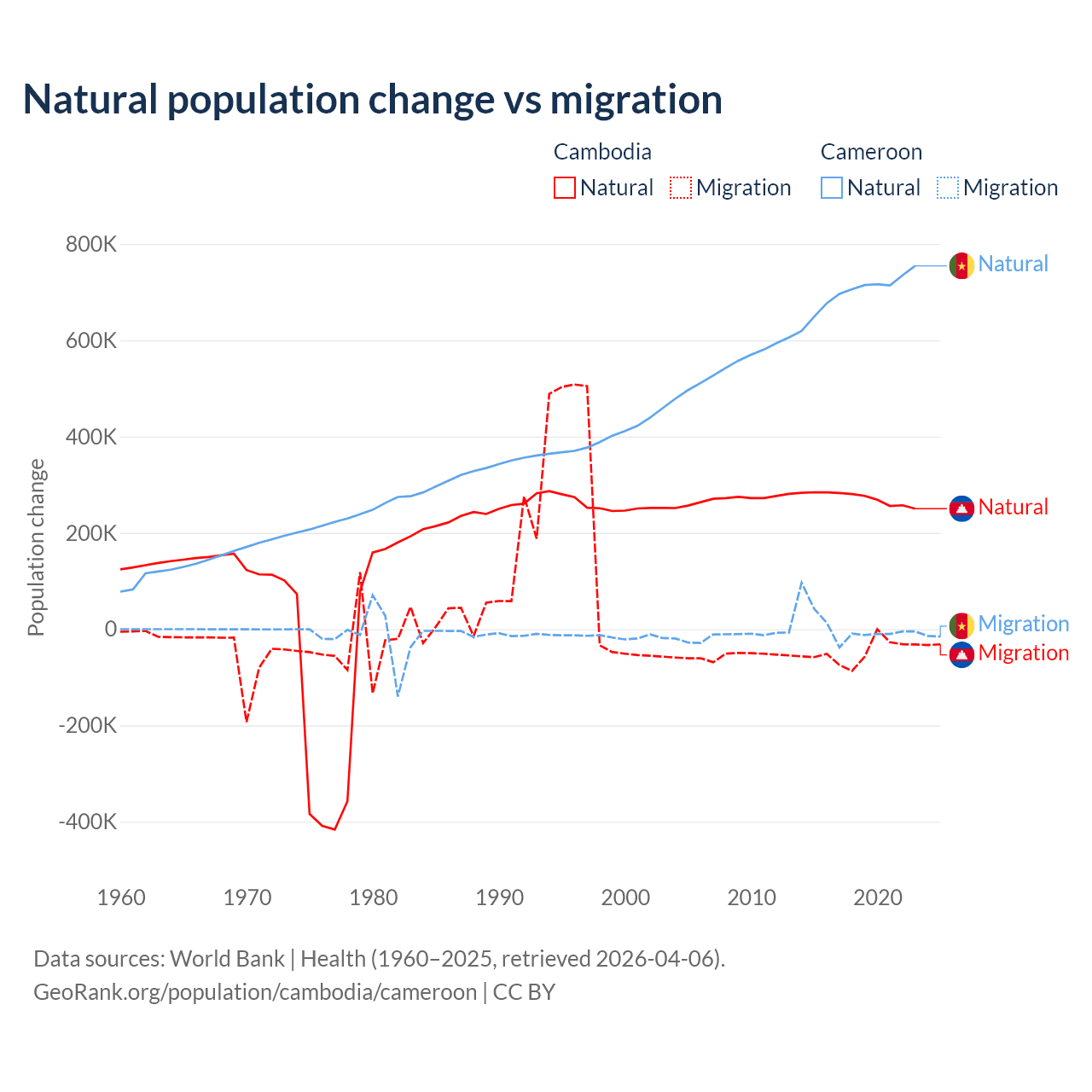 Over the last 10 years, 85.2% of the population change in Cambodia is from natural causes (a gain of 2,724,147 people) and 14.8% is from migration (a loss of 474,505 people). In Cameroon 99.1% is from natural causes (a gain of 6,982,395 people) and 0.9% is from migration (a gain of 63,139 people).