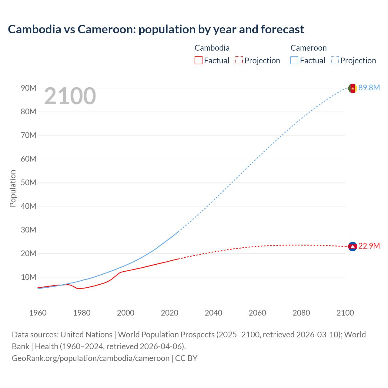 Cambodia vs Cameroon: population by year and forecast