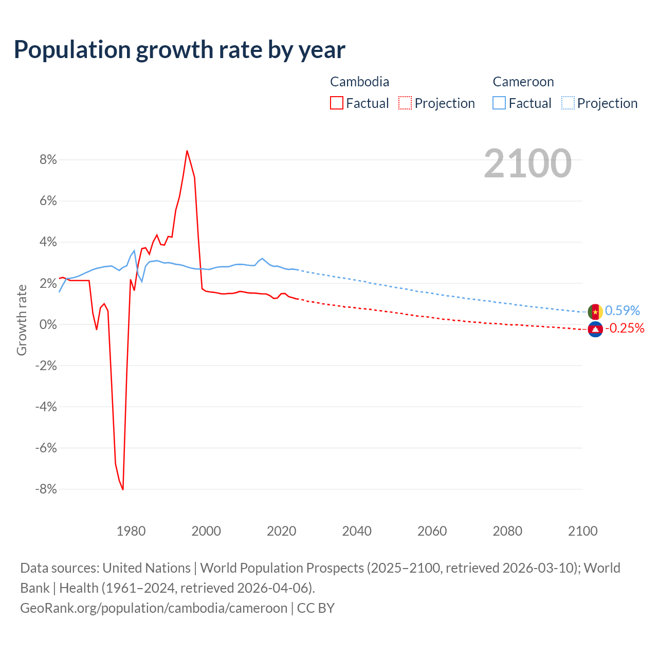 - For the last 10 years, Cambodia has had an average growth rate of +1.38% per year vs +2.84% in Cameroon.