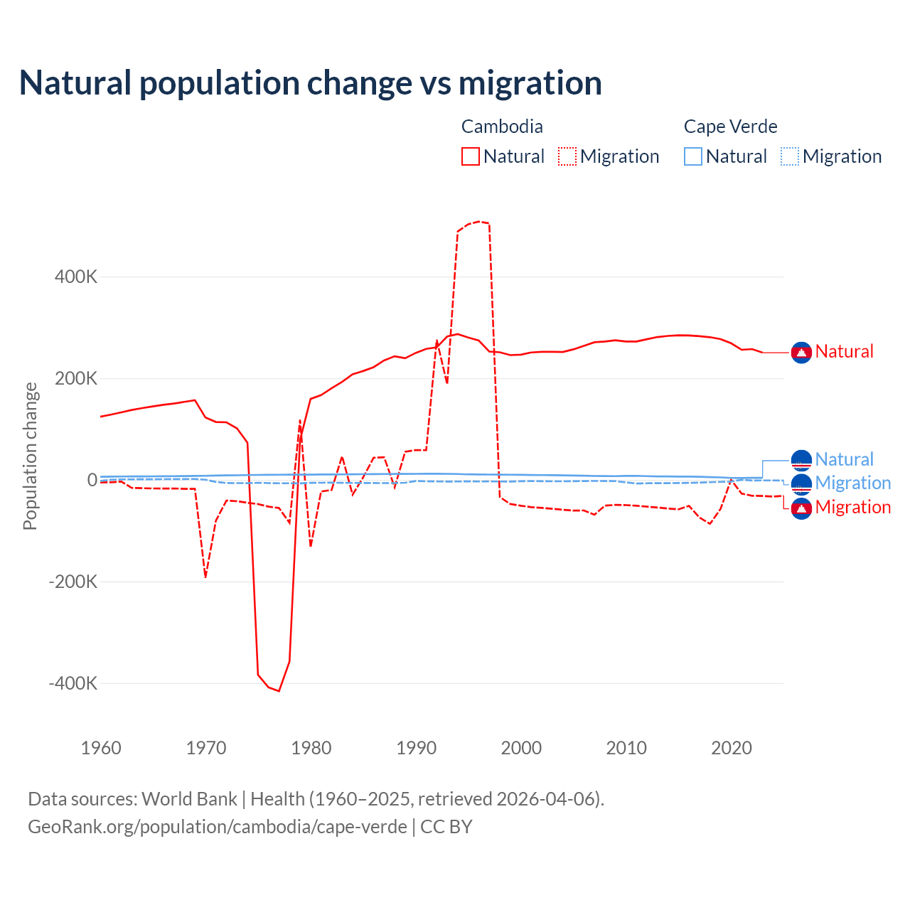 Over the last 10 years, 85.2% of the population change in Cambodia is from natural causes (a gain of 2,724,147 people) and 14.8% is from migration (a loss of 474,505 people). In Cape Verde 56.4% is from natural causes (a gain of 50,193 people) and 43.6% is from migration (a loss of 38,879 people).