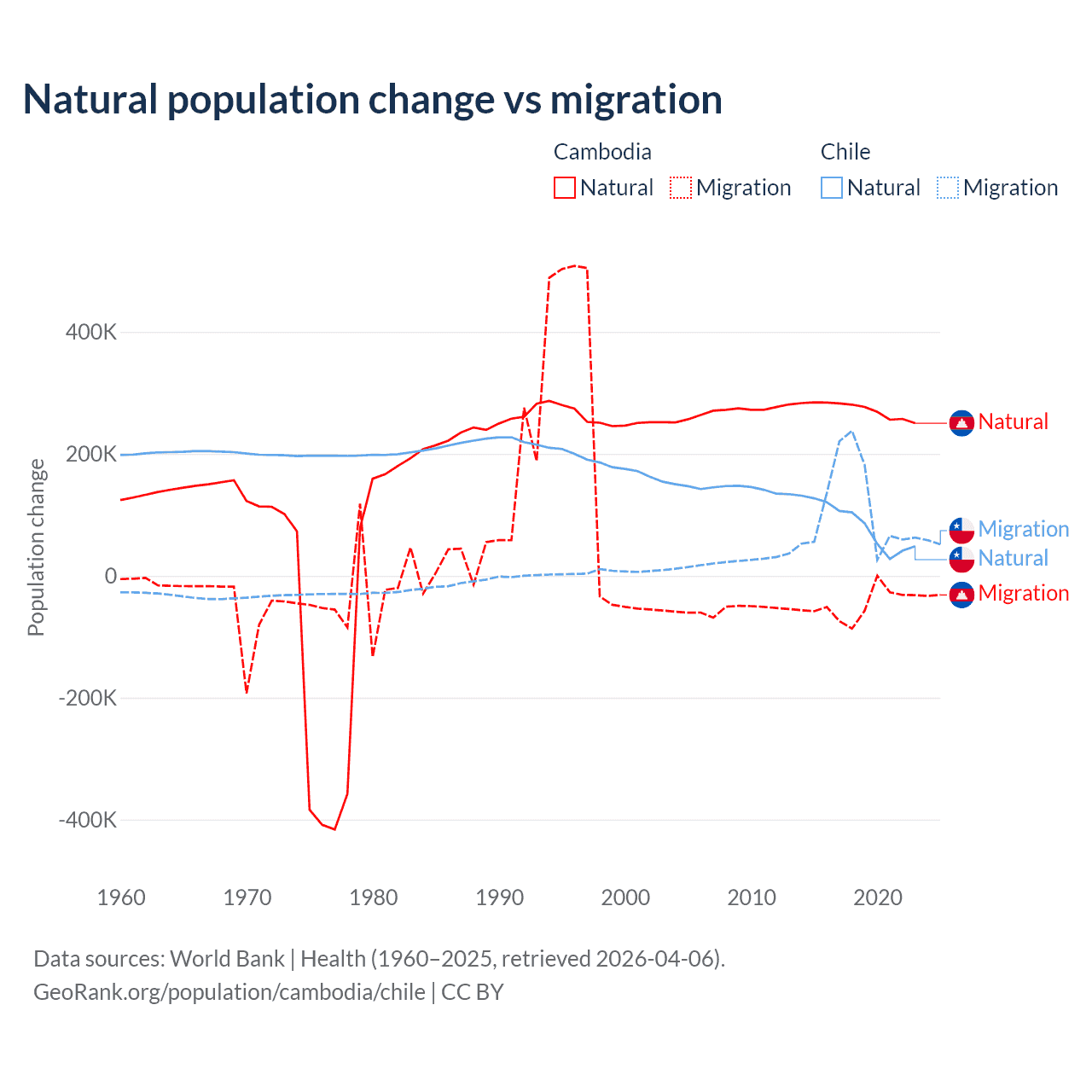 Over the last 10 years, 85.2% of the population change in Cambodia is from natural causes (a gain of 2,724,147 people) and 14.8% is from migration (a loss of 474,505 people). In Chile 43.5% is from natural causes (a gain of 844,683 people) and 56.5% is from migration (a gain of 1,097,597 people).