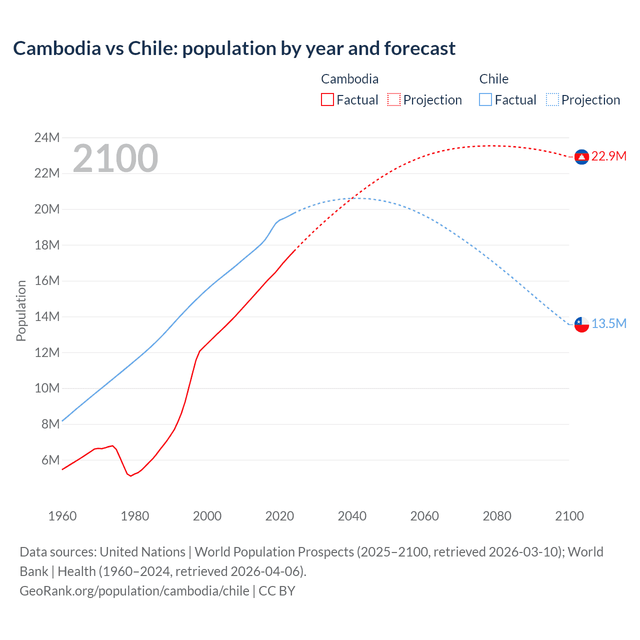 The latest officially reported population of Cambodia was 17,638,801 in 2024 vs 19,764,771 people in Chile in 2024. In 2026, based on the adjusted UN estimation, the current Cambodia's population is 18,113,986 people compared to 19,977,856 in Chile.