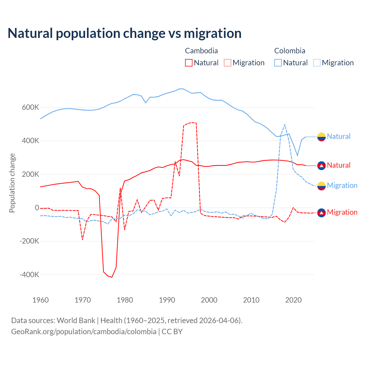 Over the last 10 years, 85.2% of the population change in Cambodia is from natural causes (a gain of 2,724,147 people) and 14.8% is from migration (a loss of 474,505 people). In Colombia 66.6% is from natural causes (a gain of 4,162,856 people) and 33.4% is from migration (a gain of 2,083,051 people).