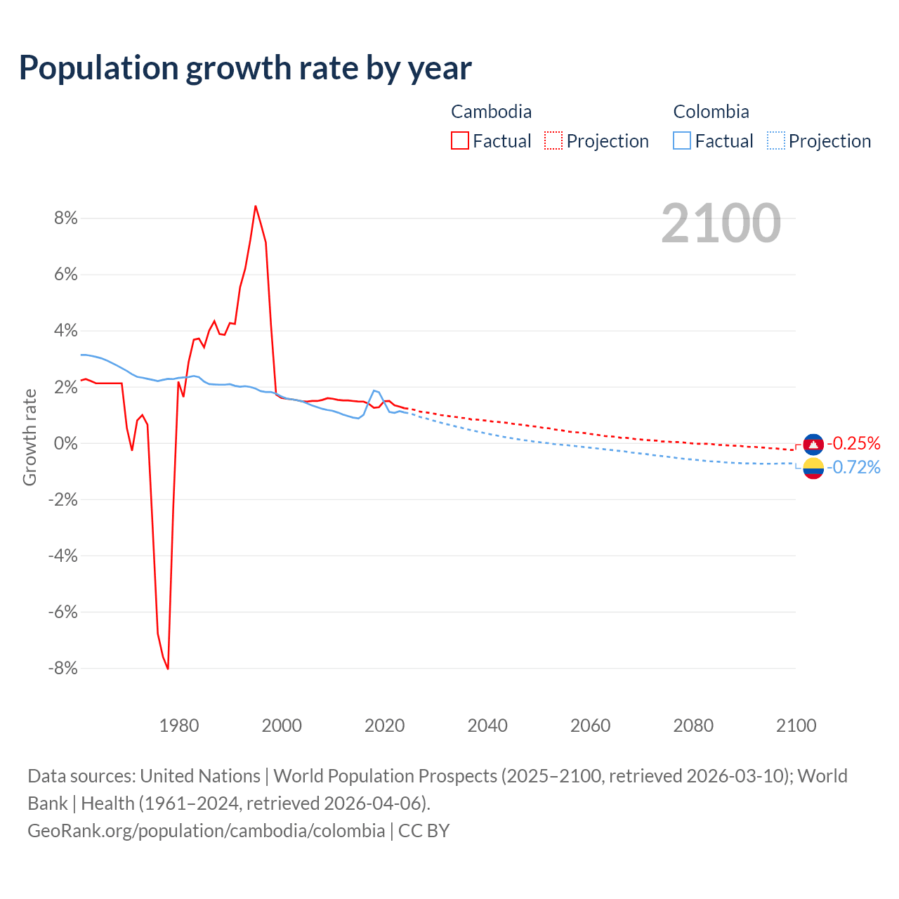 - For the last 10 years, Cambodia has had an average growth rate of +1.38% per year vs +1.25% in Colombia.