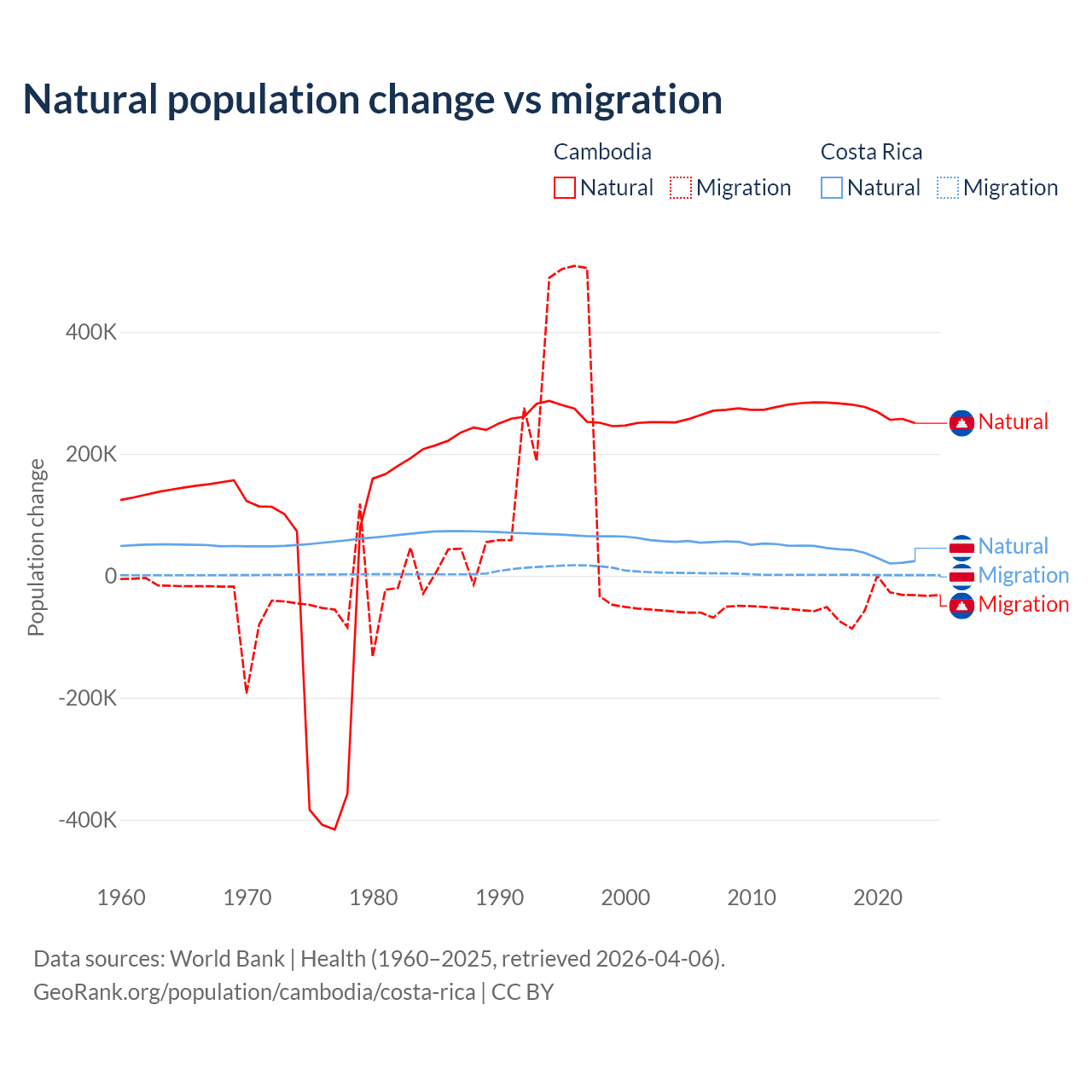 Over the last 10 years, 85.2% of the population change in Cambodia is from natural causes (a gain of 2,724,147 people) and 14.8% is from migration (a loss of 474,505 people). In Costa Rica 96.3% is from natural causes (a gain of 362,624 people) and 3.69% is from migration (a gain of 13,900 people).
